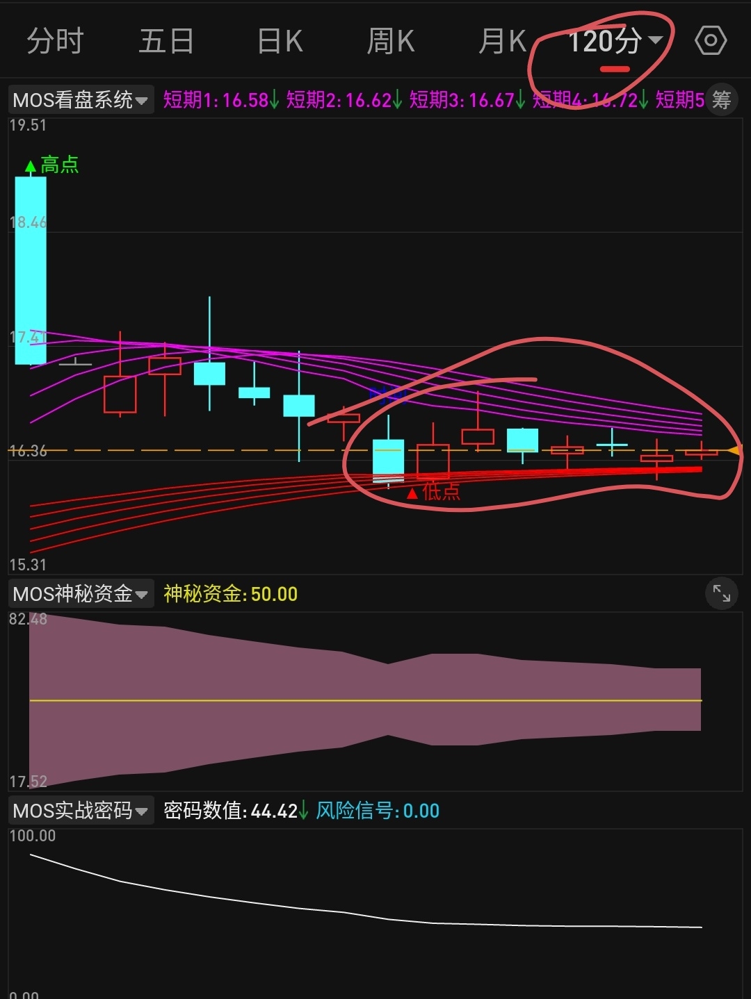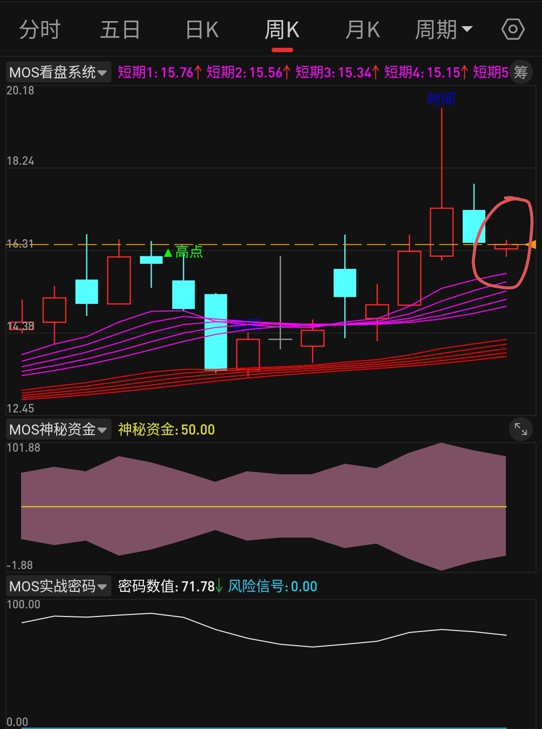 【mos跟踪妖马】真墨迹 赶紧下来吧 踩一脚周线紫色趋势带 我还在15.70-16.00这个区间等你呢