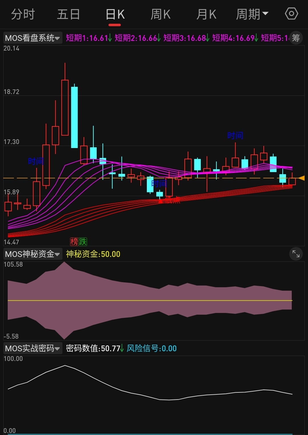 【mos跟踪妖马】最好的走势不能跌破红色趋势带 慢慢把紫色趋势带突破过去