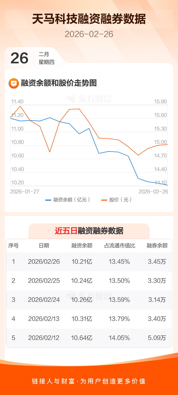 交易所最新数据显示,天马科技于2026年2月26日获融资买入1085.10万元,融资偿还1377.31万元,当日融资净偿还292.21万元。目前,该股融资余额10.21亿,占流通市值比例为13.45%。