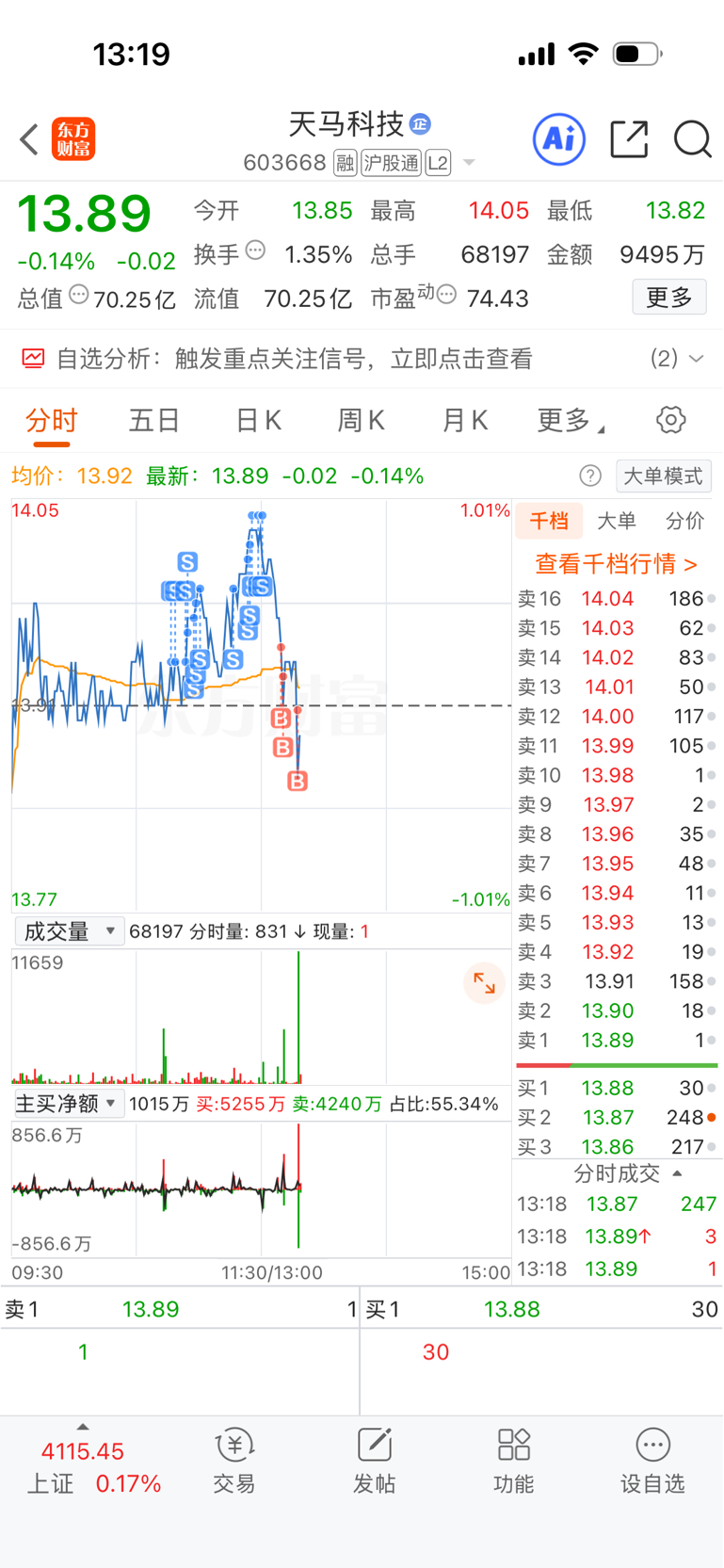 $天马科技(SH603668)$ 满仓t了一遍,怎么感觉13.8支撑不住呢