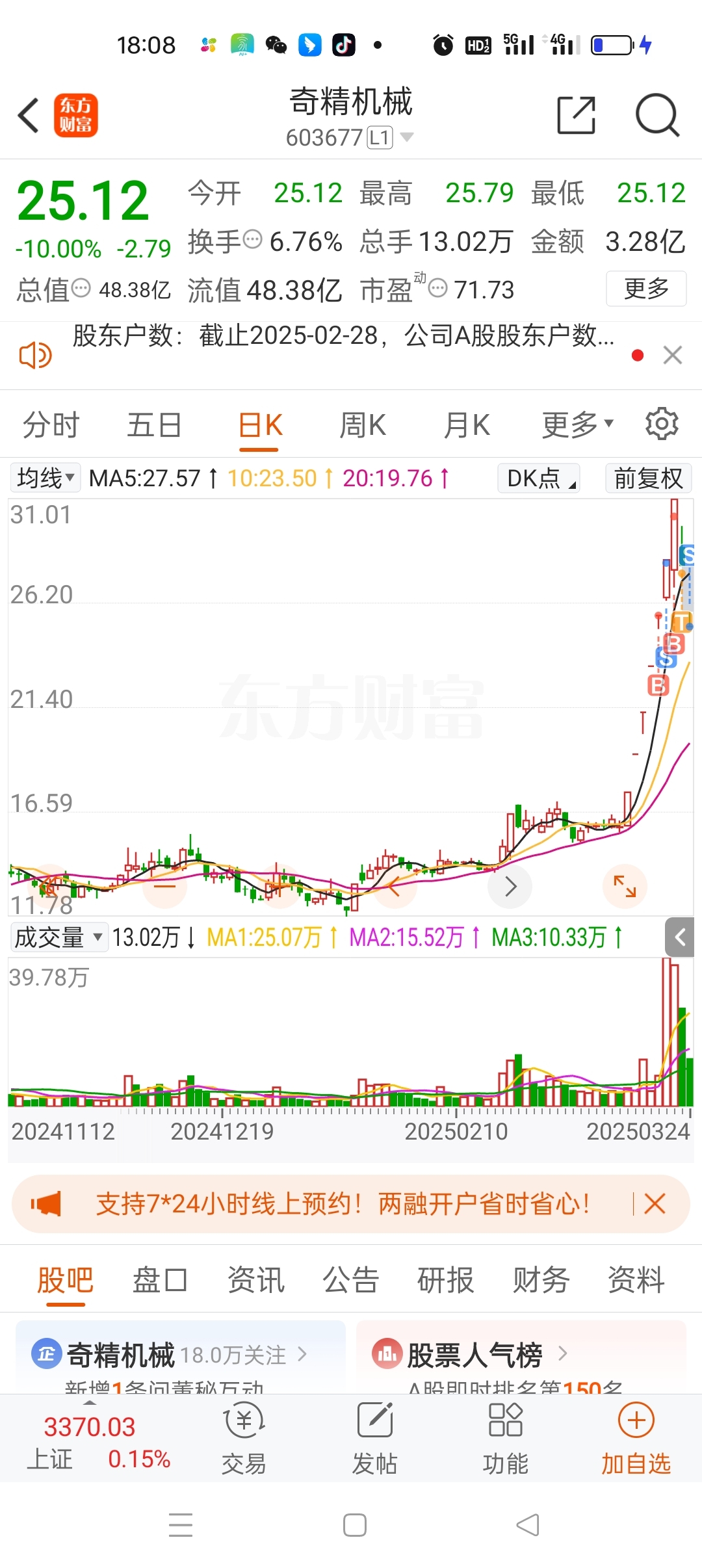 $奇精机械(SH603677)$ 市场情绪比较极端,空仓等机会吧!