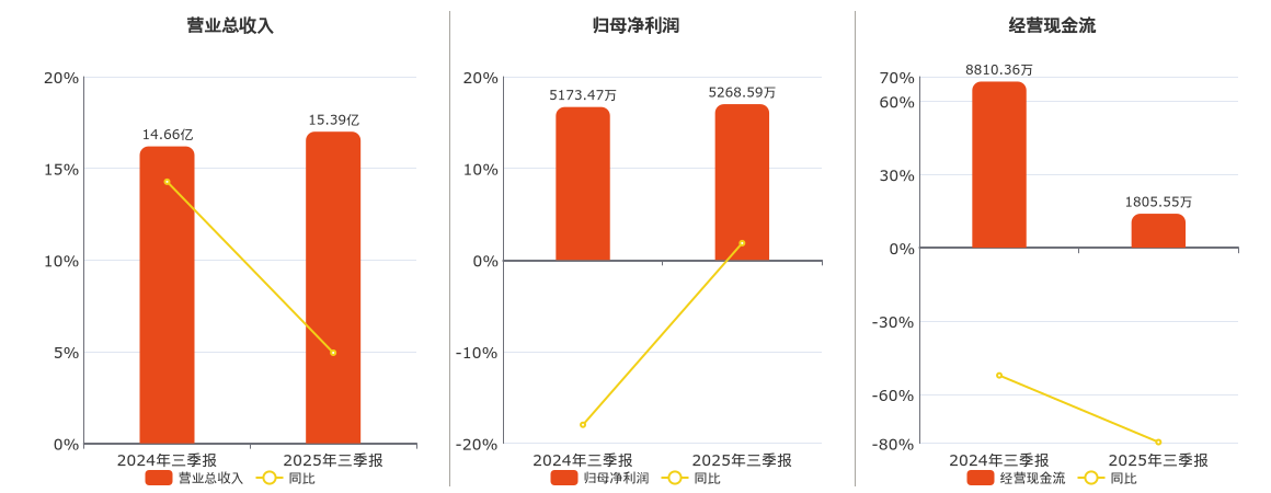 公司营业总收入为15.39亿元,较去年同报告期营业总收入增加7244.91万元,实现2年连续上涨,同比较去年同期上涨4.94%。归母净利润为5268.59万元,较去年同报告期归母净利润增加95.12万元,同比较去年同期上涨1.84%。经营活动现金净流入为1805.55万元。