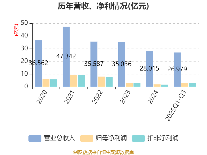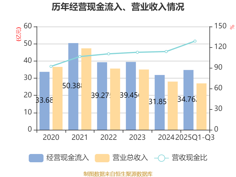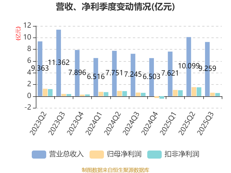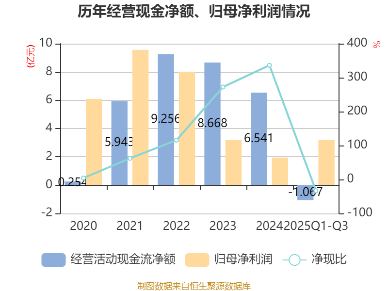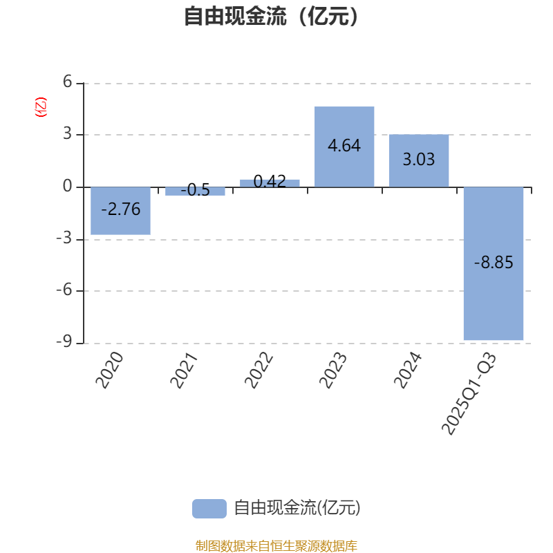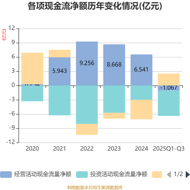 2025年前三季度,公司经营活动现金流净额为-1.07亿元,同比减少6.75亿元;筹资活动现金流净额2.51亿元,同比增加6.43亿元;投资活动现金流净额-5.34亿元,上年同期为-5.98亿元。