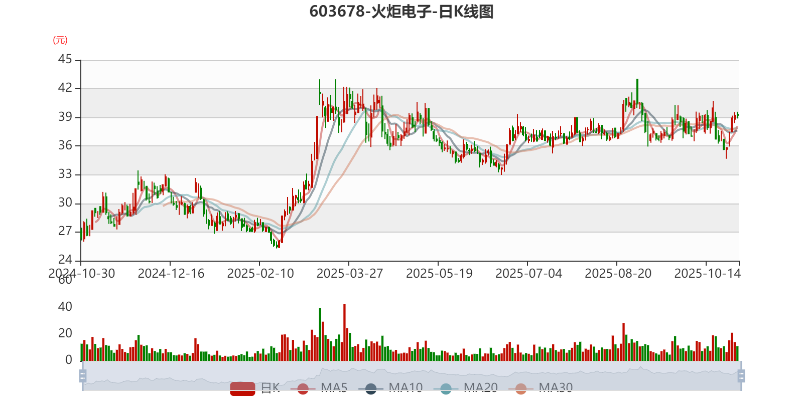 中证智能财讯火炬电子(603678)10月30日披露2025年第三季度报告。前三季度公司实现营业总收入26.98亿元,同比增长25.41%;归母净利润3.2亿元,同比增长41.76%;扣非净利润3.06亿元,同比增长44.11%;经营活动产生的现金流量净额为-1.07亿元,上年同期为5.68亿元;报告期内,火炬电子基本每股收益为0.69元,加权平均净资产收益率为5.43%。