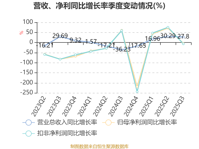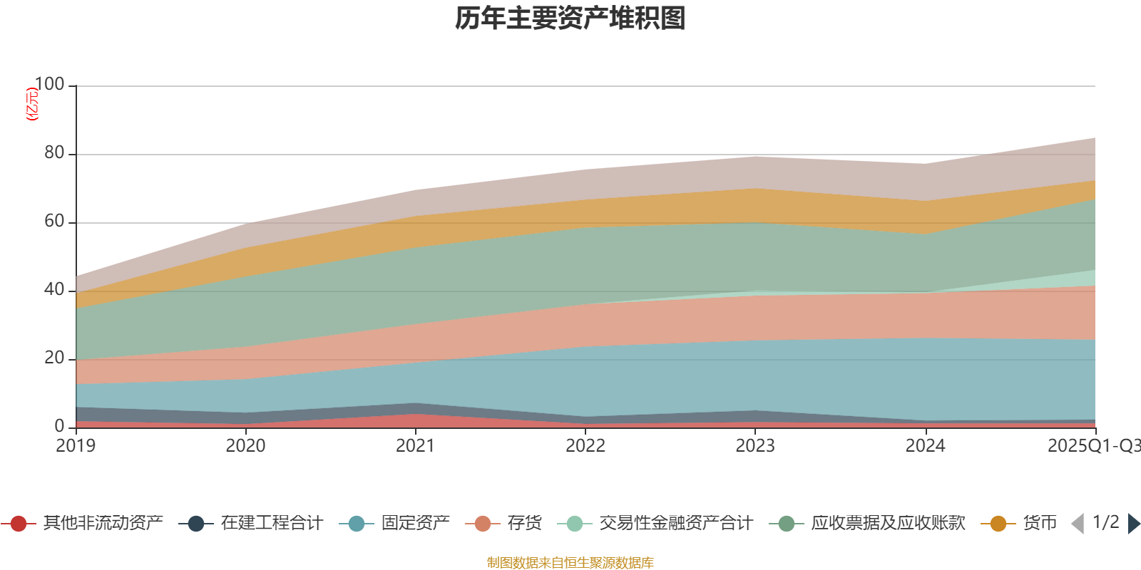 资产重大变化方面,截至2025年三季度末,公司货币资金较上年末减少43.28%,占公司总资产比重下降6.09个百分点;交易性金融资产合计较上年末增加1601.46%,占公司总资产比重上升5.09个百分点;固定资产较上年末减少3.14%,占公司总资产比重下降3.71个百分点;应收票据及应收账款较上年末增加21.58%,占公司总资产比重上升2.34个百分点。