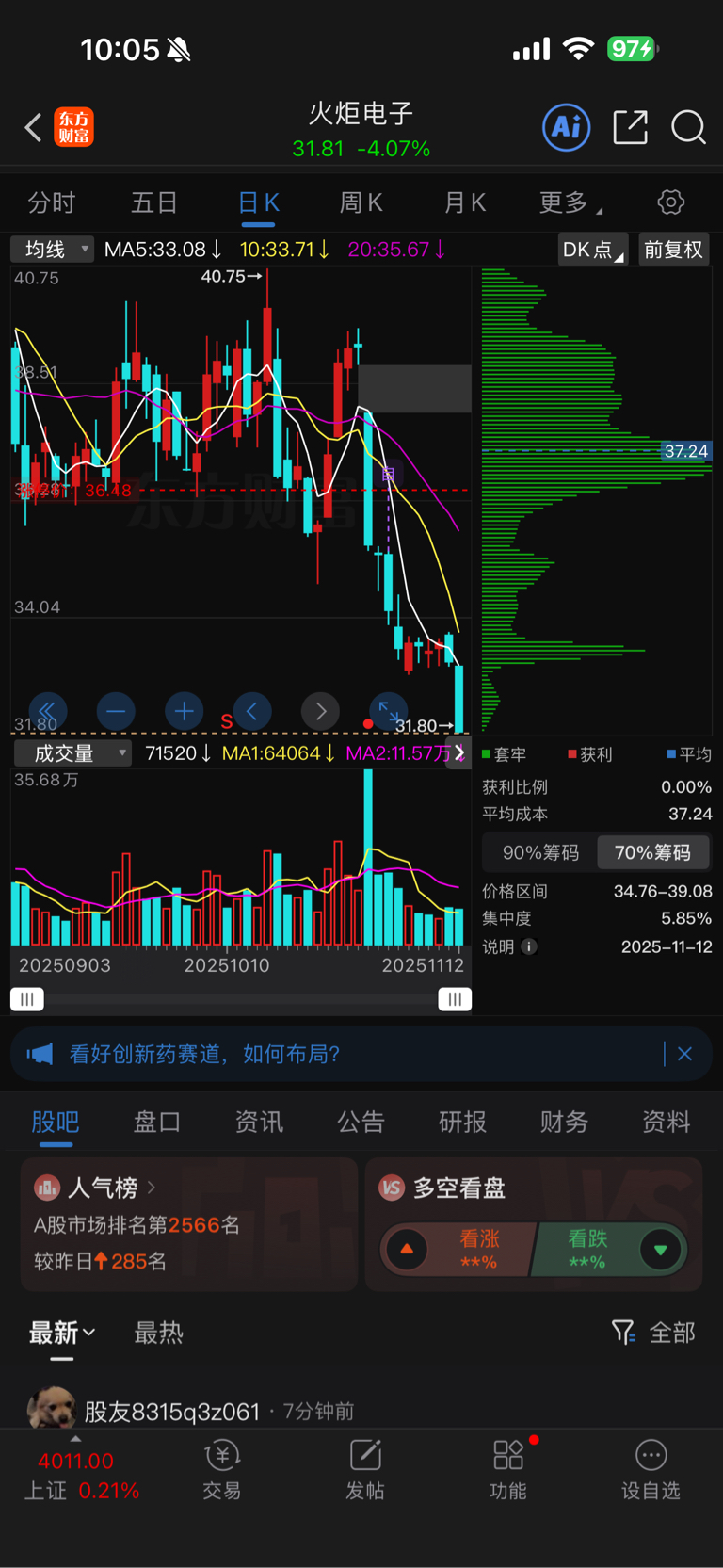$火炬电子(SH603678)$ 加入自选那天以为到底了,没想到还有大坑,幸亏没进,不然嫁妆都没了