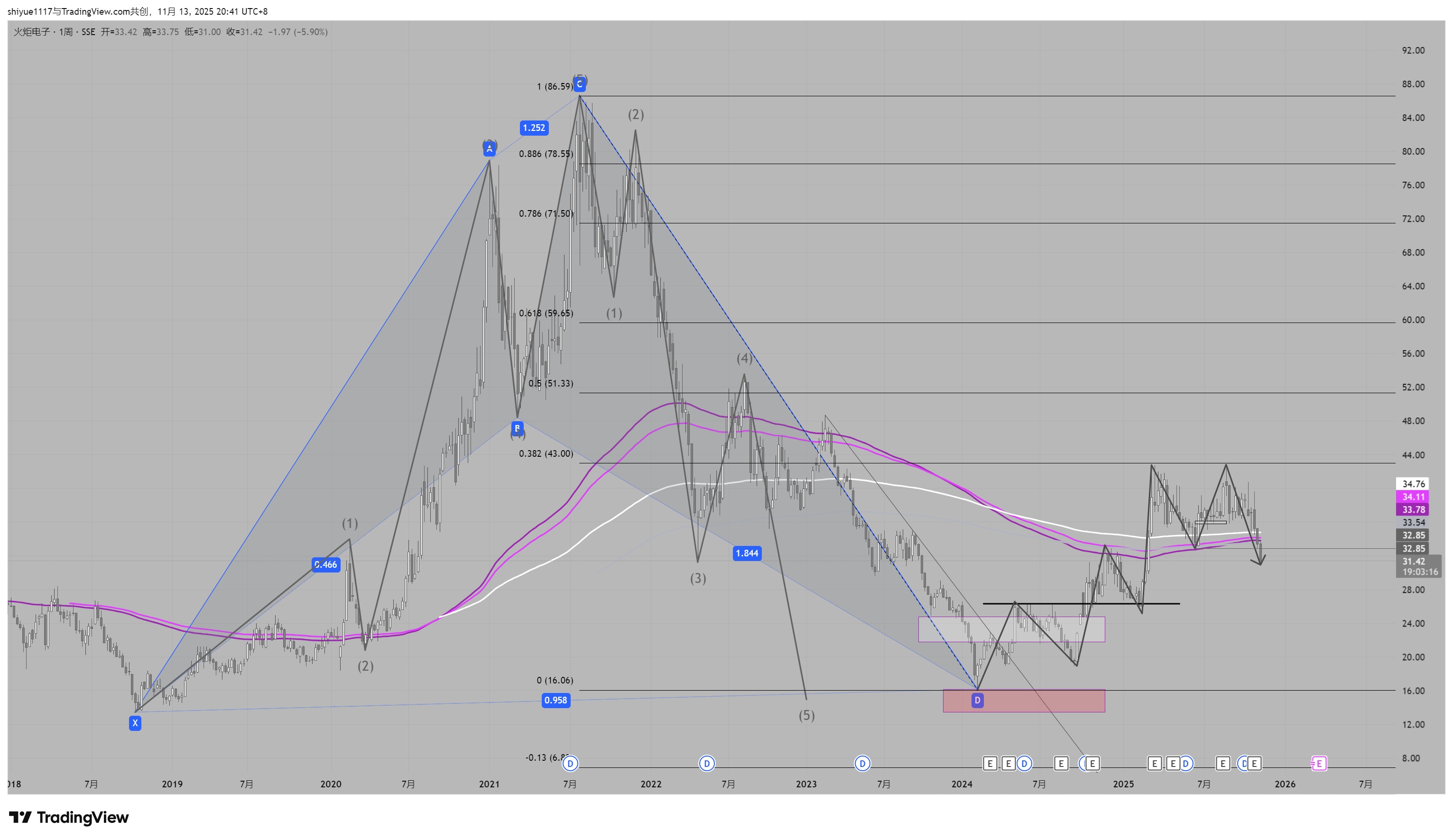 更新下图表,火炬电子自D点开始多头结构上涨,但是股价在CD的0.382遇到强阻力,两次上攻均被压制。而当前股价已打破多头结构,跌破前低点位,短期内可能难以完成51元目标,故在此处终结该笔交易。