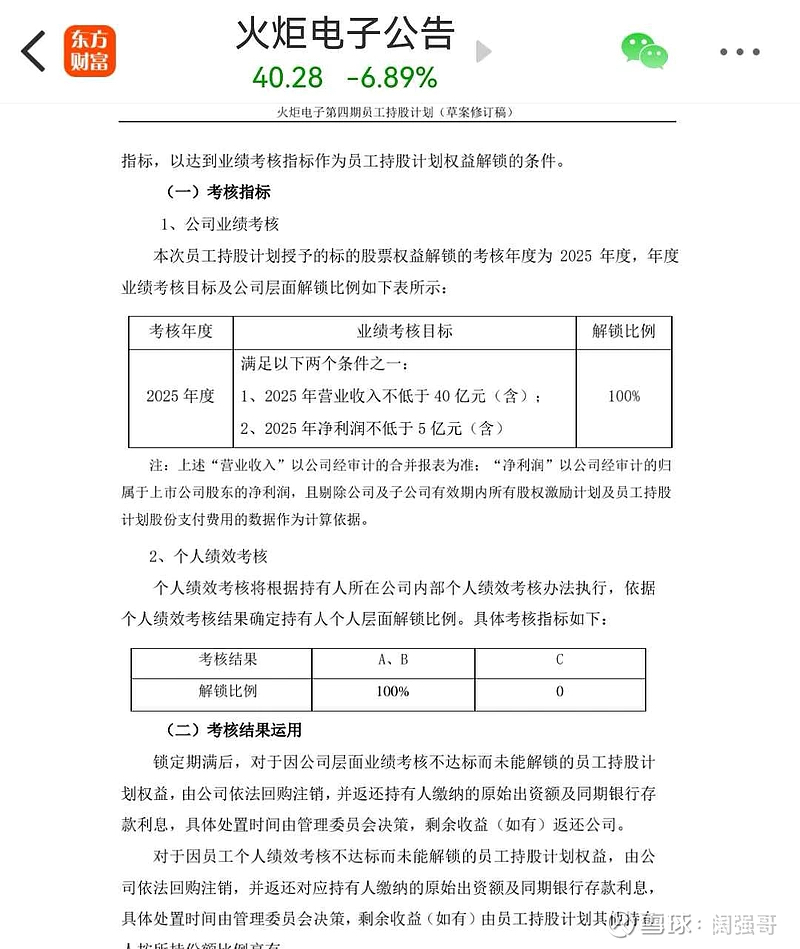 $火炬电子(SH603678)$ 这公司谎话连篇劣迹斑斑,去年初的员工持股解锁条件,纯粹是为了可转债强赎诱骗投资者