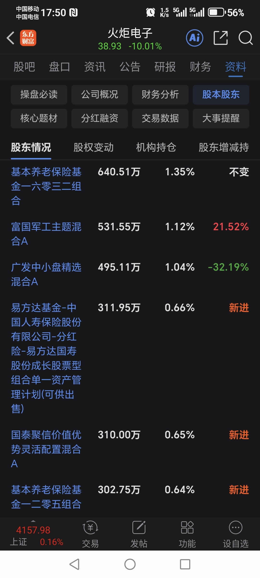 火炬电子两只养老基金合计950万股都还在里面,且均为十大股东,平均持仓价为38元左右。有的散户胡说养老基金早跑了,怎么可能跑?养花基金为国家队,均为长线投资基金,股价不到50元绝对不会卖的。不知道散户们在慌张卖出去为什么?若真是大户在出货,怎么可能跌停板才只有400多手在堆量卖出。最迟下个星期一必涨5个点,立帖为证。