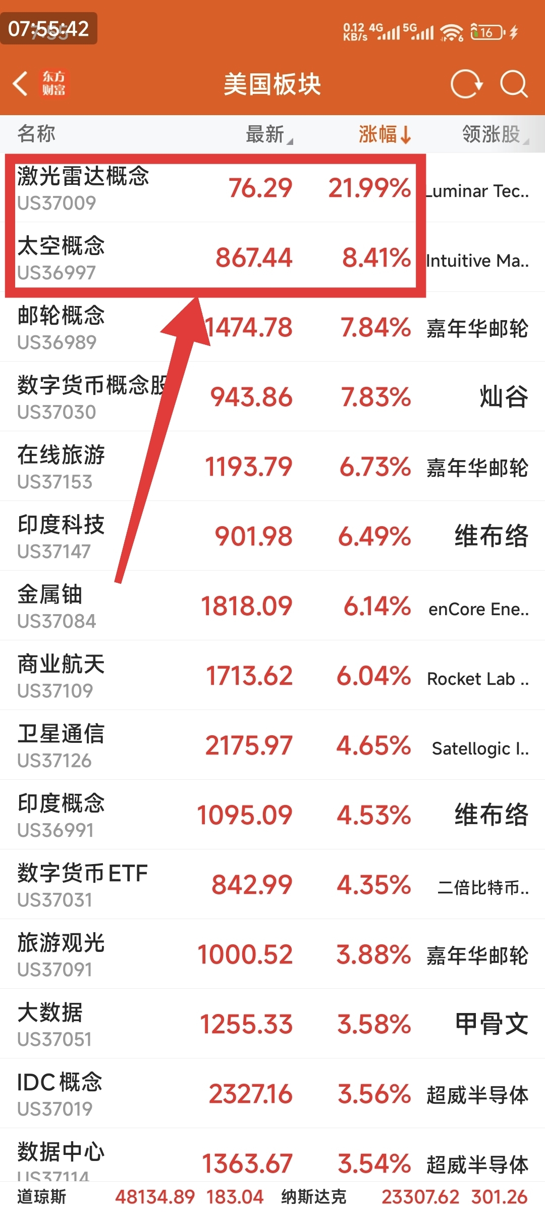 周五晚上,美股自动驾驶激光雷达和航天太空板块涨幅第一、第二!