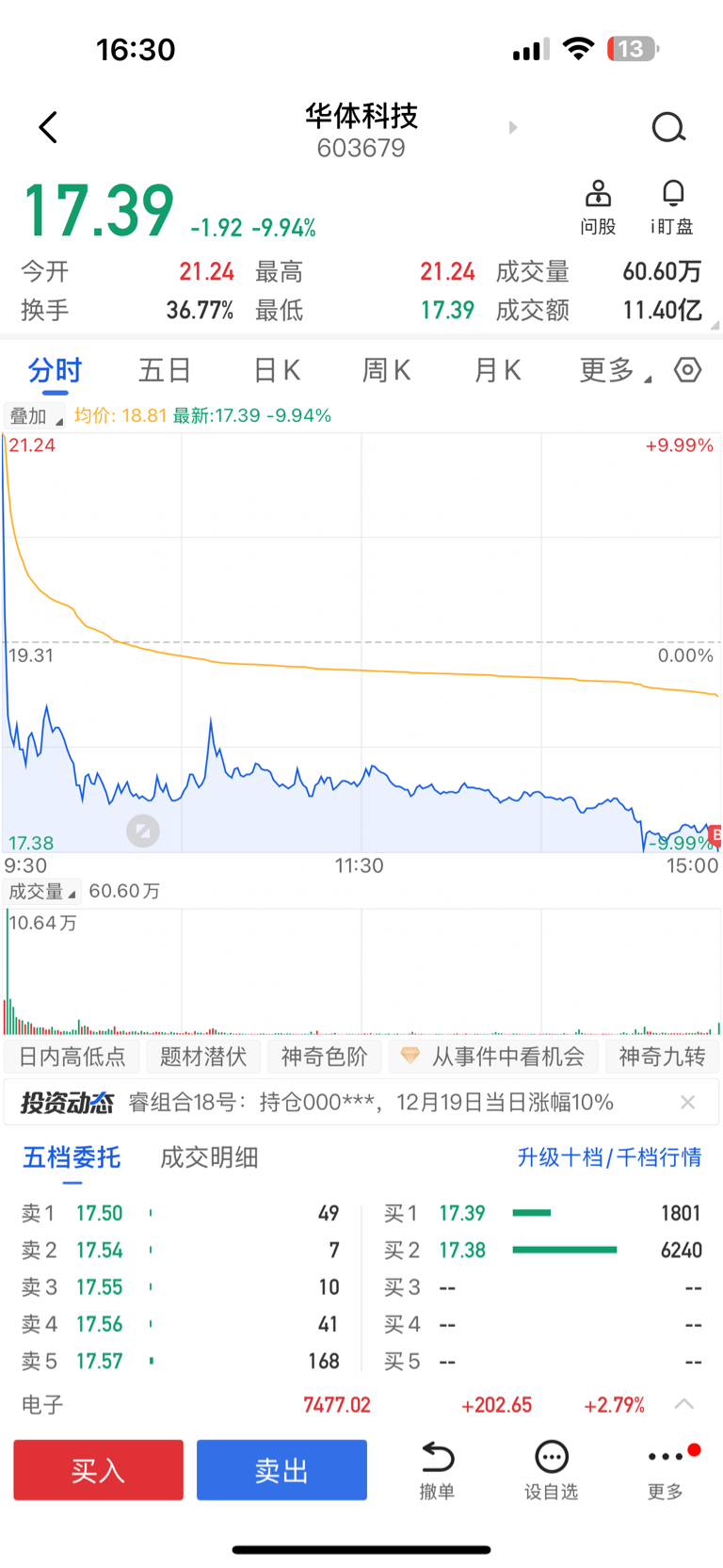 $华体科技(SH603679)$ 最后3分钟竞价买入,17.39元成交