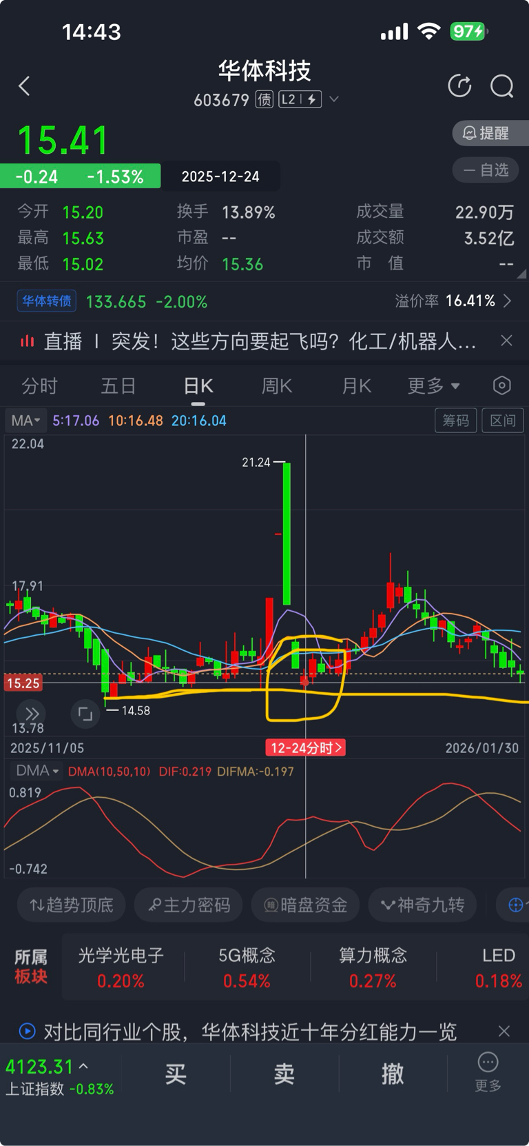 发财的机会越来越近了,要是下周干到15块下方就漂亮了,我就怕下周15.41附近他