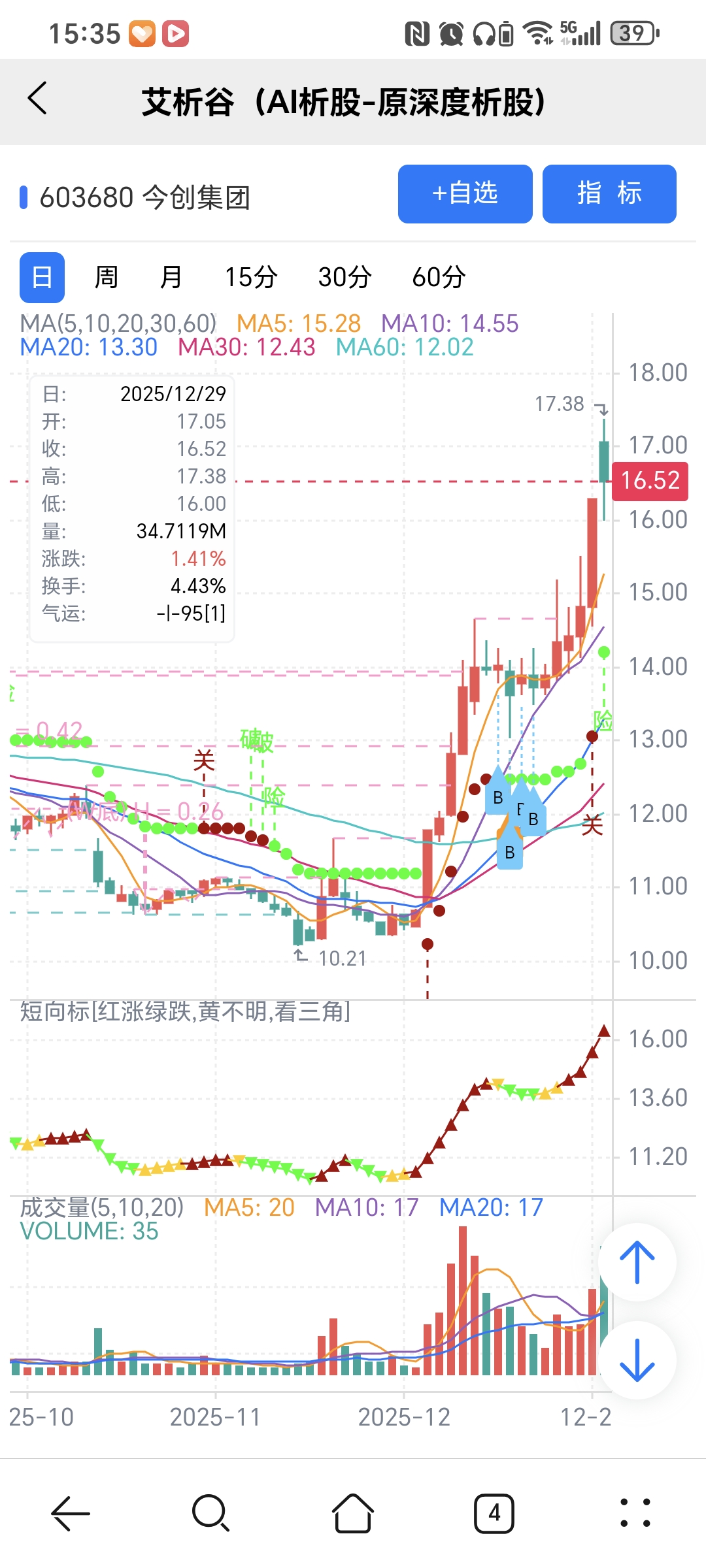 红绿小圆点是艾析谷的量化指标-超级短趋线,是趋势跟踪+突破类的量化指标,完全免费。