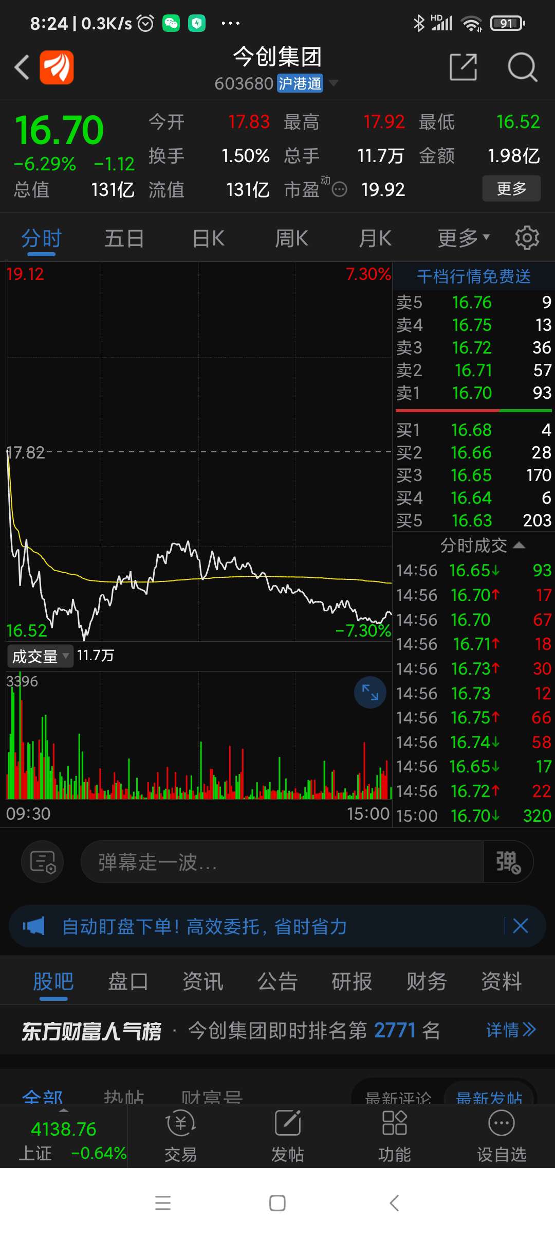 今创集团昨日表现。