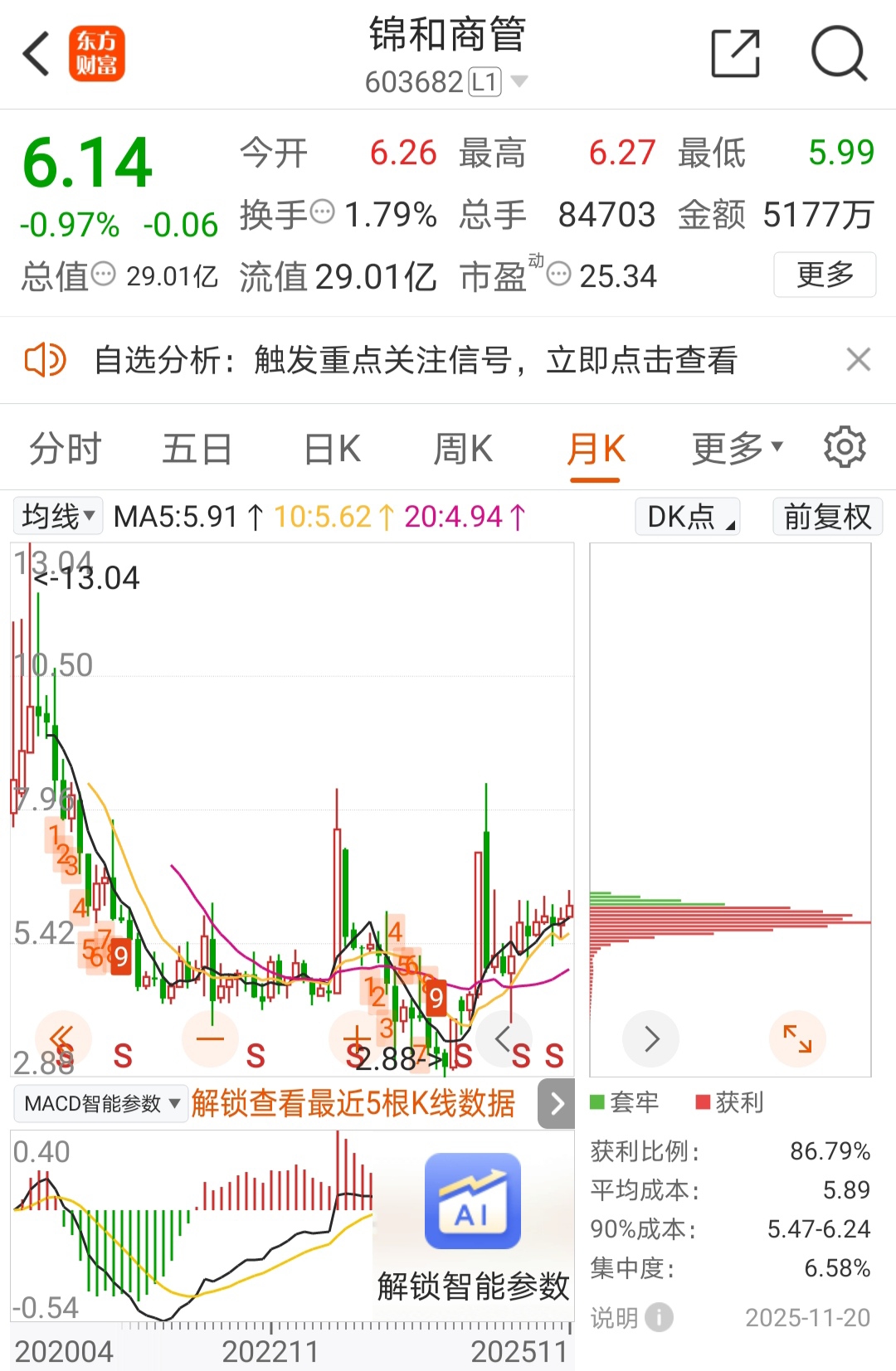 大盘巨量宽幅震荡上行趋势未变,个人觉得今年4000点,无论如何都是挡不住的。锦和盘小绩优每年2次分红,盘中主力控盘迹象相当明显,目前该股仍运行在标准的中期上升通道内,坡度虽缓若蜗牛线,但资金安全的情况下,分2次钱再填权等明年再分钱,完全也可以接受