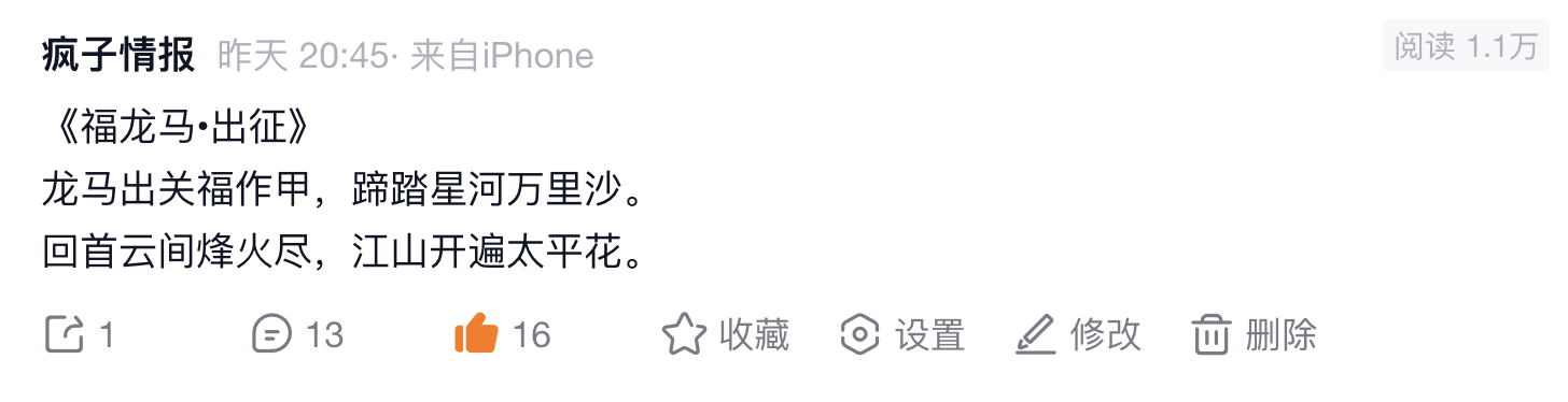 《福龙马•出征》龙马出关福作甲,蹄踏星河万里沙。回首云间烽火尽,江山开遍太平花。