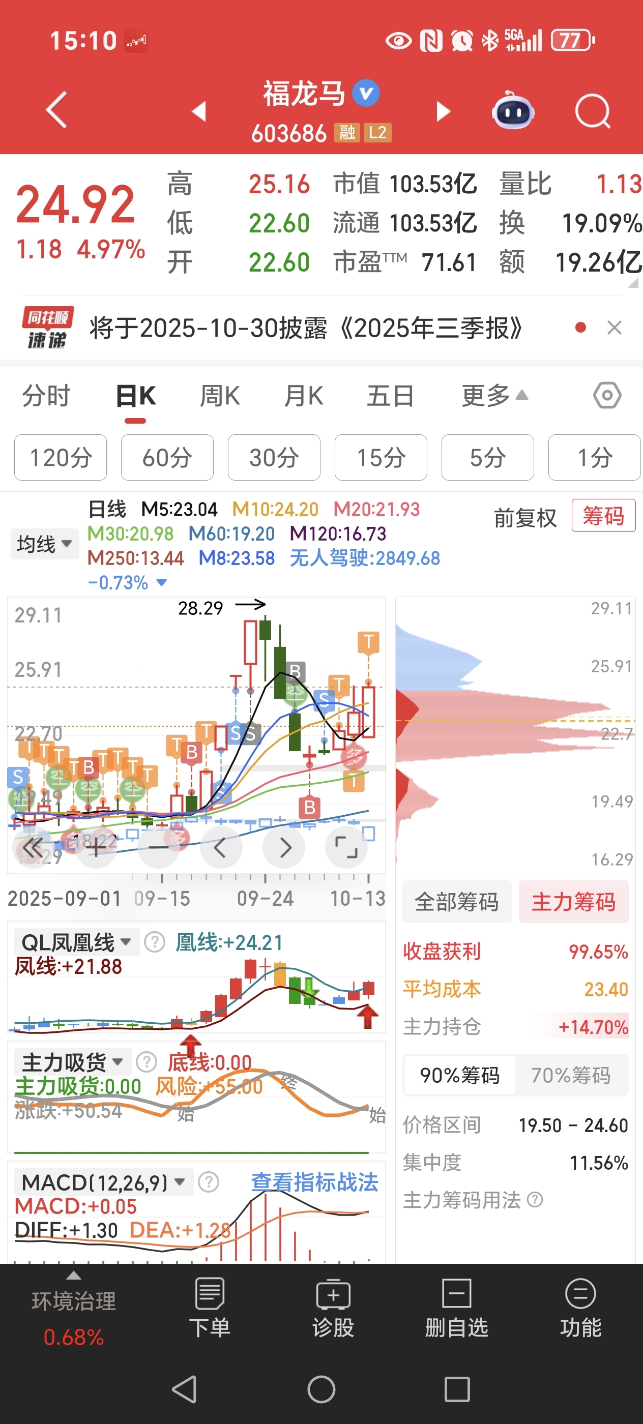 $福龙马(SH603686)$ 早开盘前22.71买不进去,23.1追进去的,盘中做了1块多的t,尾盘有点冲动又补了点,整体小马今天盈利不到7个点。明天最好洗一下盘,整体趋势挺好的,继续跟踪