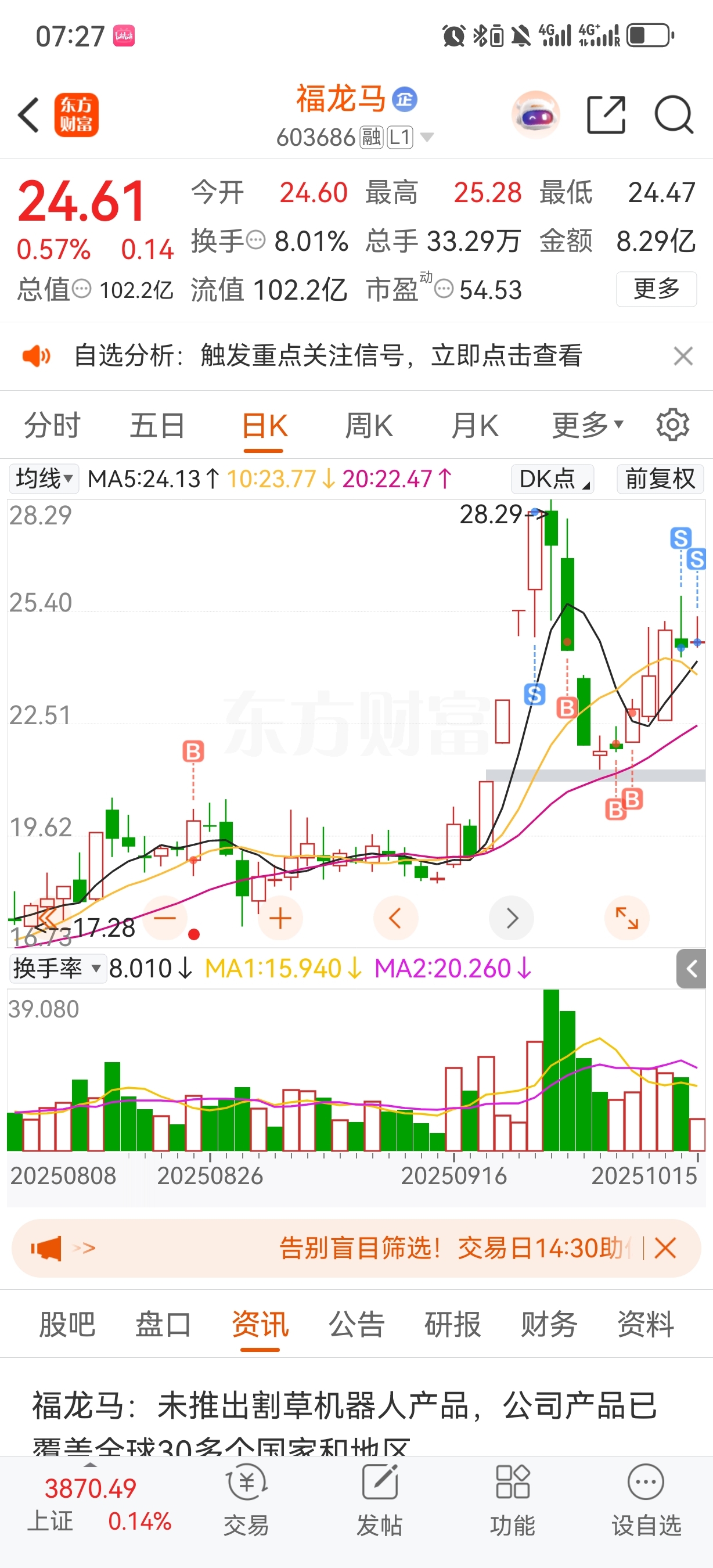 $福龙马(SH603686)$ 很早之前就进来了,但还是感觉这两天在出货,昨天卖了一半,今天直接清仓了,祝车上的兄弟们发财!