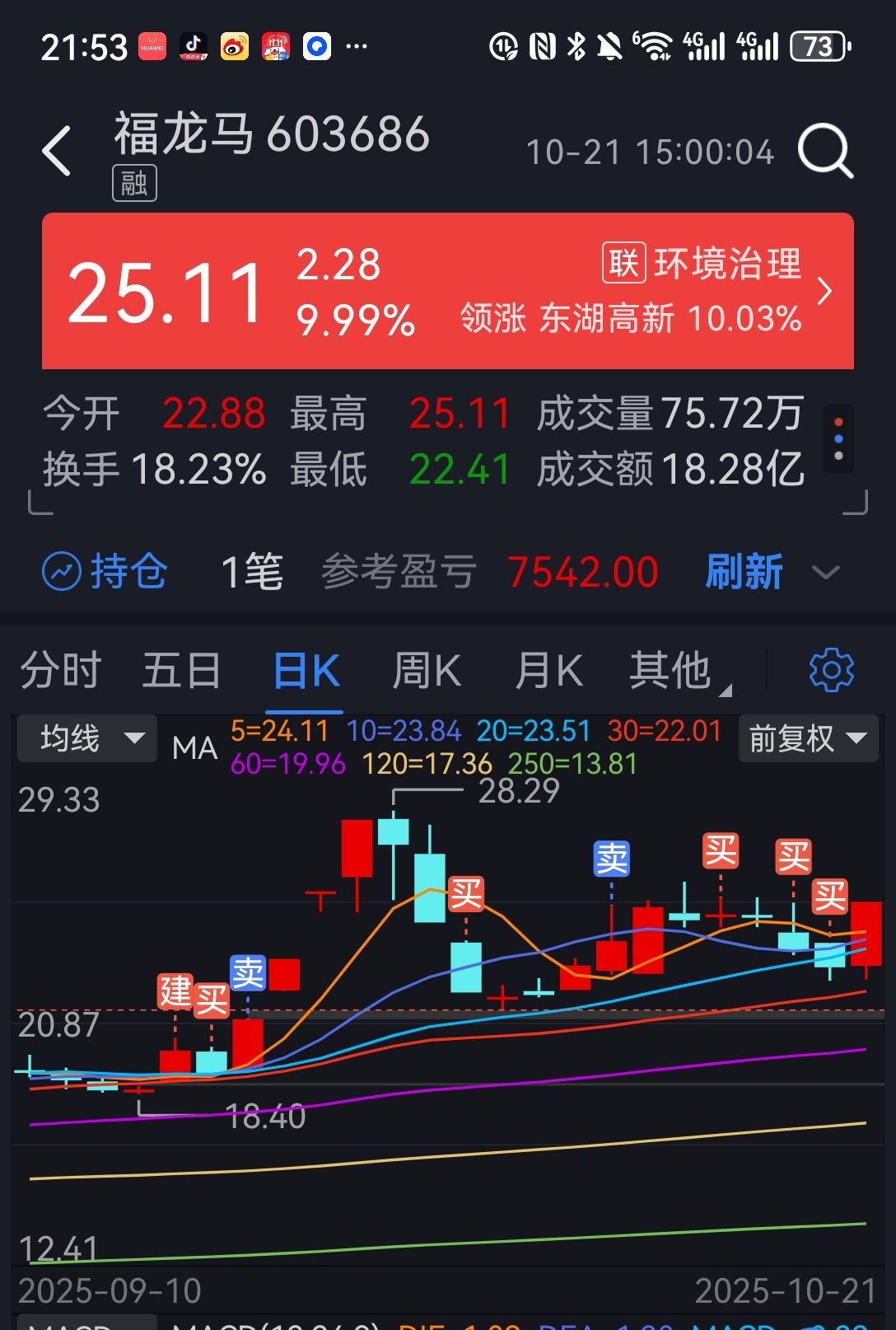 $福龙马(SH603686)$ 加仓成功,可惜今天加仓挂低了三分没有成交,不过也是大获全胜