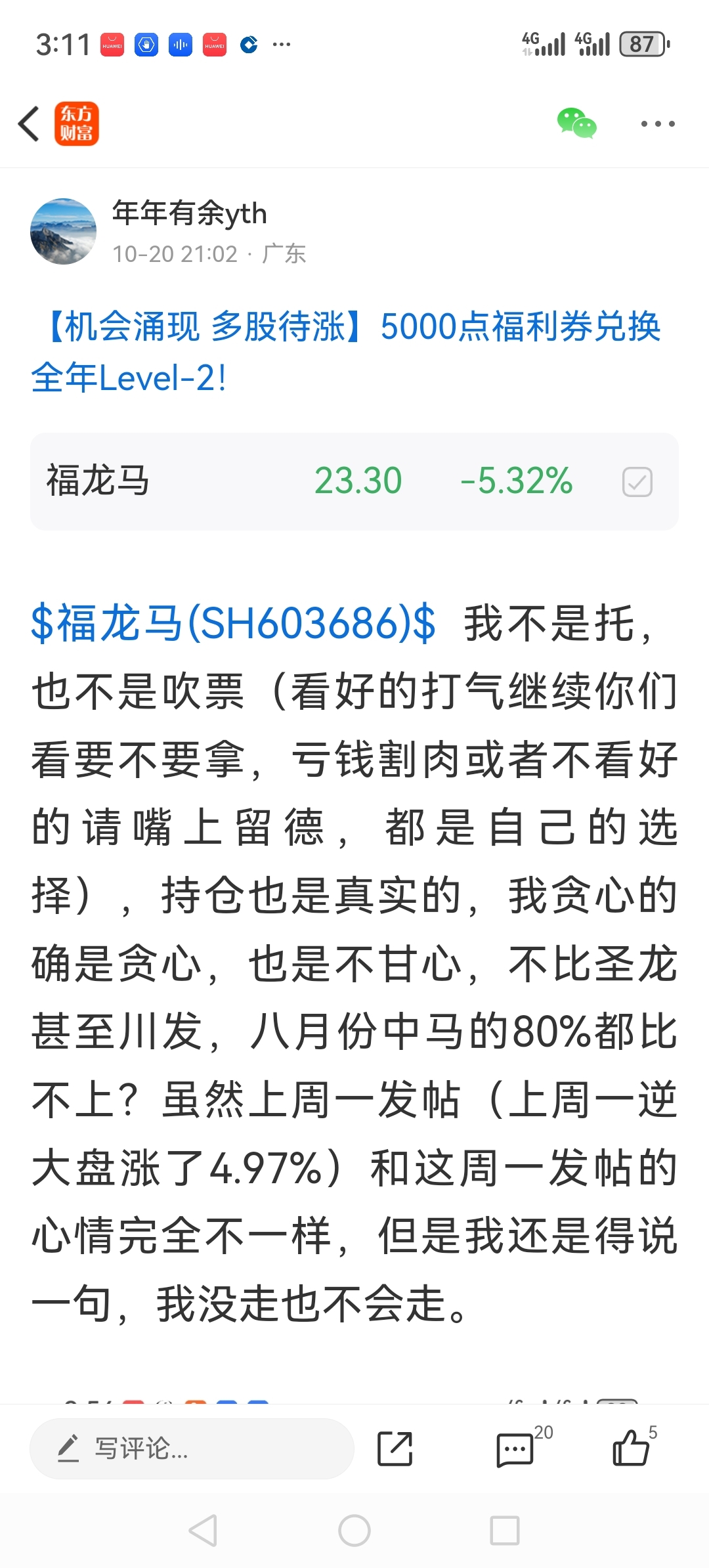 $福龙马(SH603686)$ 虽然我还没走(以前我发的动态有持仓记录),大家还是不要进了这个破股了,就算后面还会有炒高潮炒马生肖,也不会有什么高度了。我拿了大半年,这股就是一穷庄,反复收割。前天我宁愿跌回20,拉涨停干嘛?把我们当猴耍,真有意思。