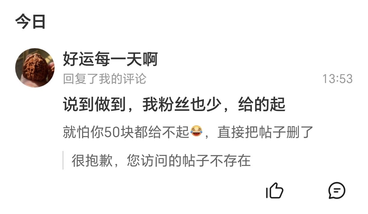 $福龙马(SH603686)$ 那个“好运每一天”,唱的不累的吗,说好收盘不是25以下每人50块,你先把50块钱给我再说吧,别删帖啊