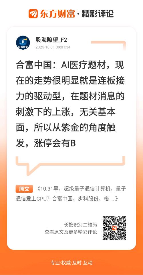 $合富中国(SH603122)$合富中国:昨天个股出现了再次涨停的情况,已经连续三个交易日走出涨停板的动能。主要是从消息面传出,目前公司推出了AI诊断医疗等,已经在跟北京同仁医院等各大医院签订了相应的合作,并且推进科研的商业化成果,另外则是公司目前的各类的手术医学教学智能化平台,已经在大陆本地化生产。所以属于两岸题材的概念,最后则是盘中传出了在医疗方面的相关的传闻的利好,所以受此影响之下,还会有继续上升的动能。当前来说,从技术结构形态比较的简单,目前来讲,周线级别的压制已经被完全突破的情况之下,上方已经没有任何的压力,所以短线的技术结构形态如果过了11,那么将会走一波长牛行情。