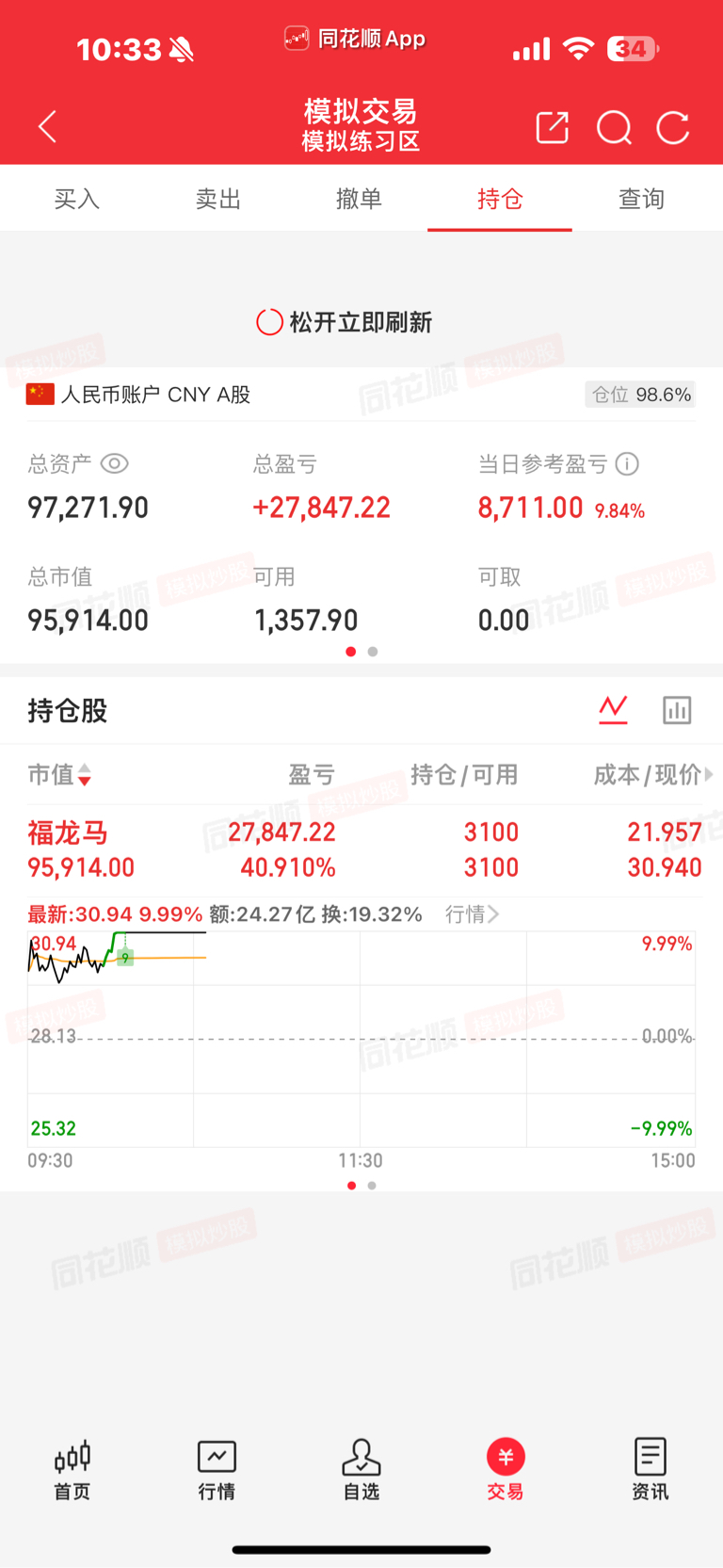 $福龙马(SH603686)$ 满仓不动已经 40 个点了