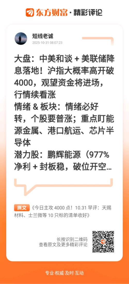 今天A股三大指数大概率会直接高开,并且还会重新突破4000点大关,昨天盘后迎来重大利好,中美和谈成功,我们的A股也会受到积极的影响,现在很多观望的人都应该会进来,利空该释放的也释放得差不多了,美联储降息的靴子成功落地,所以接下来的行情继续看涨。