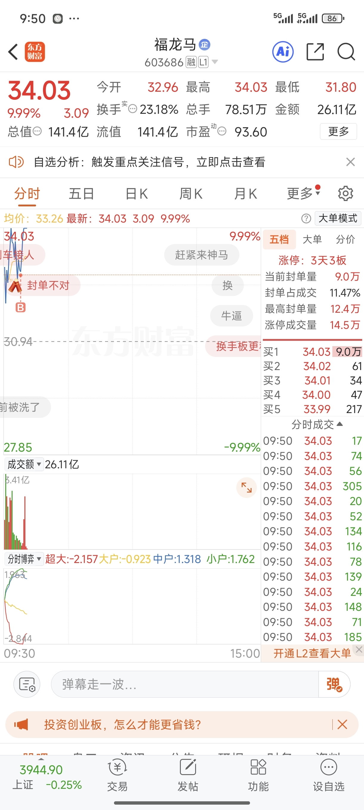$福龙马(SH603686)$ 要炸板?
