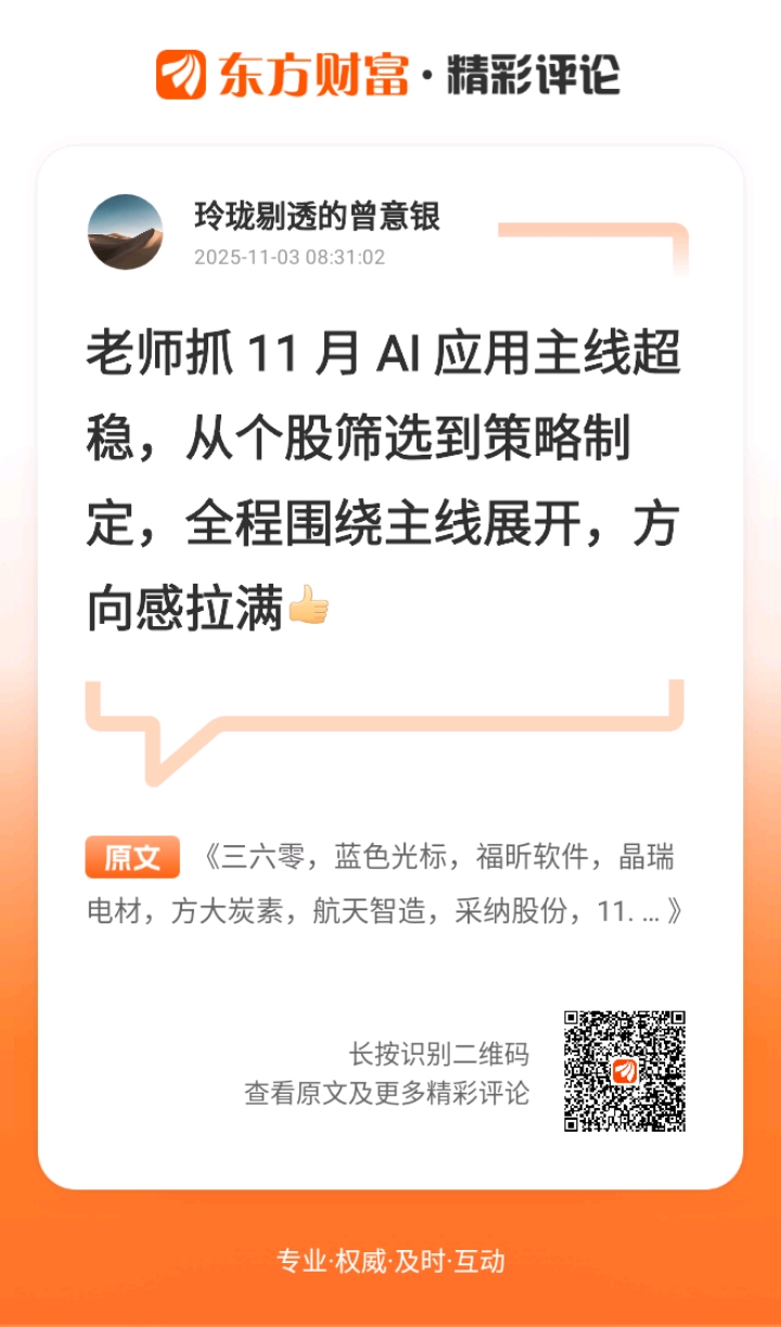 最后想说:我不是股神,就是和你一起复盘、踩坑的搭子。有拿不准的标的或赚钱经验,评论区聊聊;吃到肉也来报喜,咱们 11 月稳稳吃肉!
