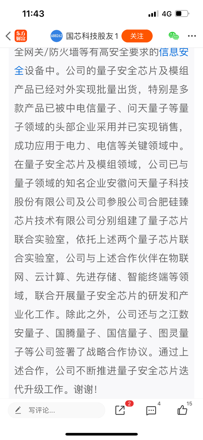 $福龙马(SH603686)$ 量子科技被纳入十五五重点发展规划,正在经历0-1的阶段,后续政策会越来越多值得关注。国芯科技参股多个量子公司,并与多个头部量子公司成立联合实验室,目前公司也有量子科技产品批量出货,可以加入观察仓长期跟踪。