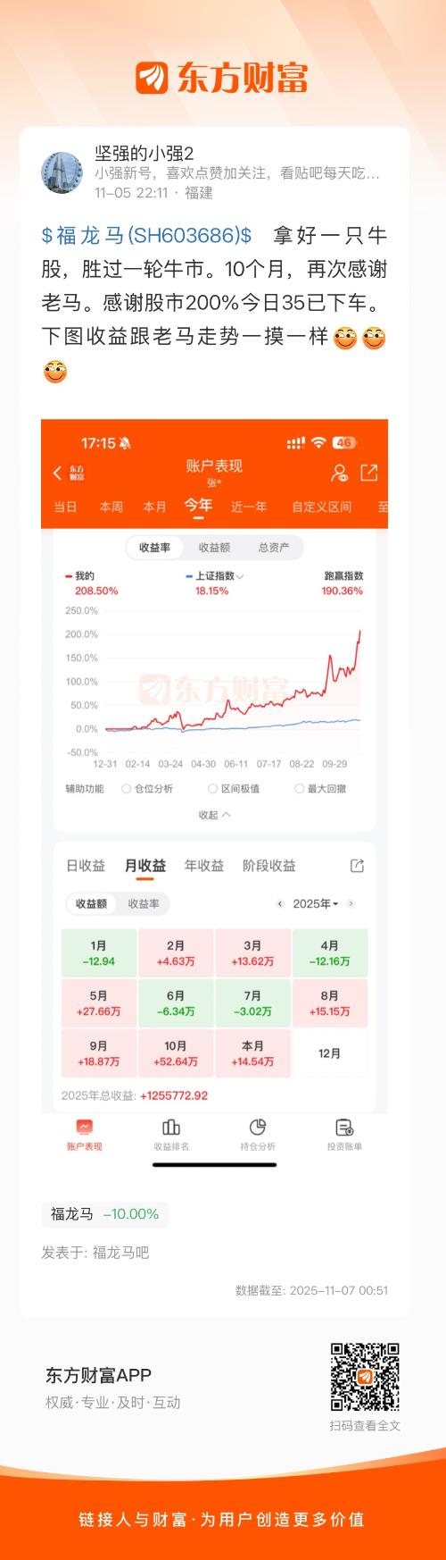 $福龙马(SH603686)$ 拿好一只牛股,胜过一轮牛市。10个月,再次感谢老马。感谢股市200%今日35已下车。下图收益跟老马走势一摸一样