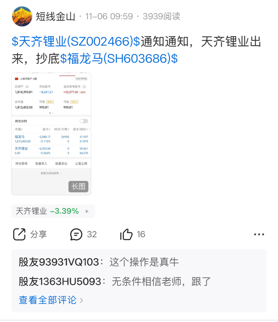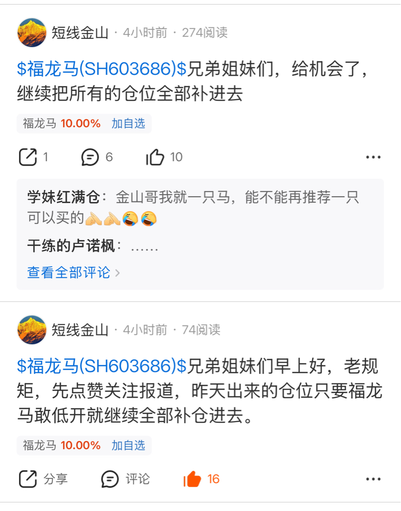 $福龙马(SH603686)$ 有图有真相,时间终于击破了质疑声,感谢信任金山的铁粉,我还是那句话,我要做最真实的博主,金山盘中不会多只标的,认认真真的做好一只,不管盈亏都会真实公布跟踪,对关注我的人负责,还没给金山点关注的抓紧点个关注哦。