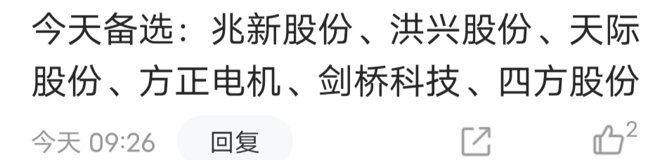 尊重市场!掌握规律!多看消息!看懂趋势!学会形态!把握机会!才能持续有所收获,我们要成长也要成功;集合竞价时间是衡量个股和抉择的重点方向之一,以后个人备选会在评论区盘前探讨,今天备选:兆新股份、洪兴股份、天际股份、方正电机、剑桥科技、四方股份、其实心情能影响人运气,这里不便多说