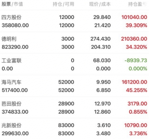 目前个人持有、四方股份、德明利、海马汽车、芭田股份、兆新股份,胜不骄败不馁,祝所有老铁收获满满。