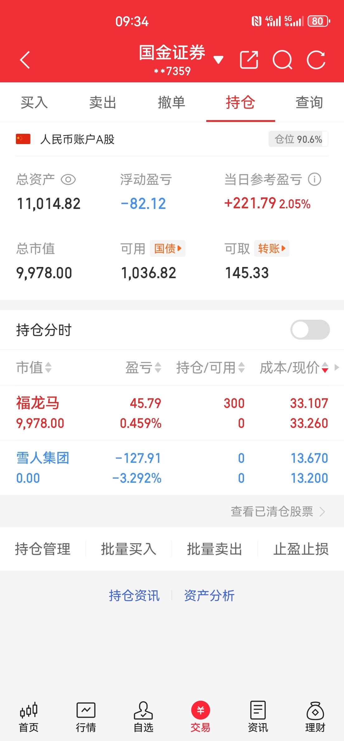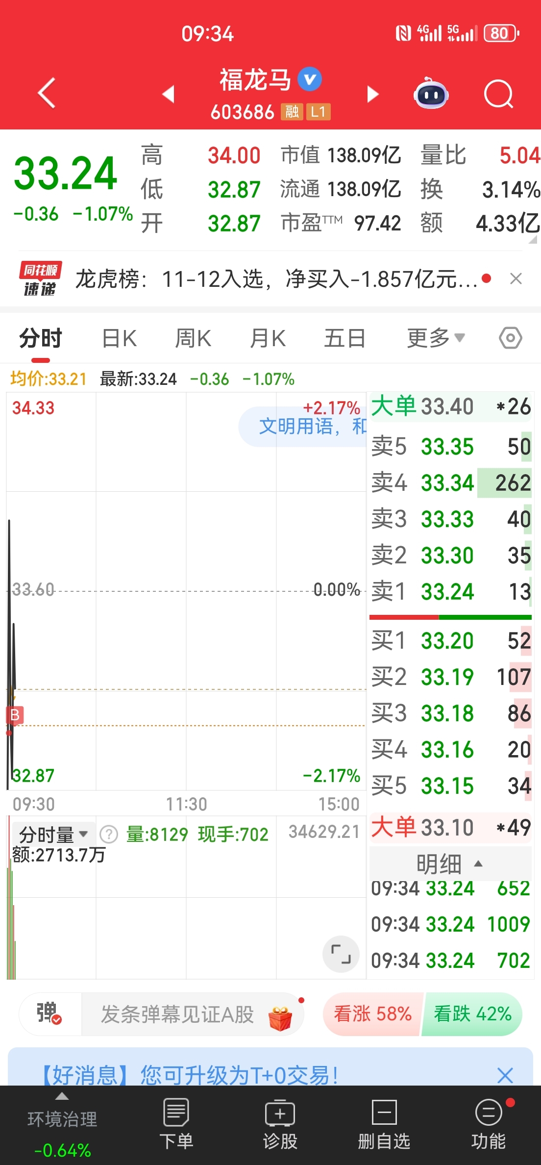 $福龙马(SH603686)$ 一万到一百万第18天,开盘雪人走了,-1.5买了福龙马