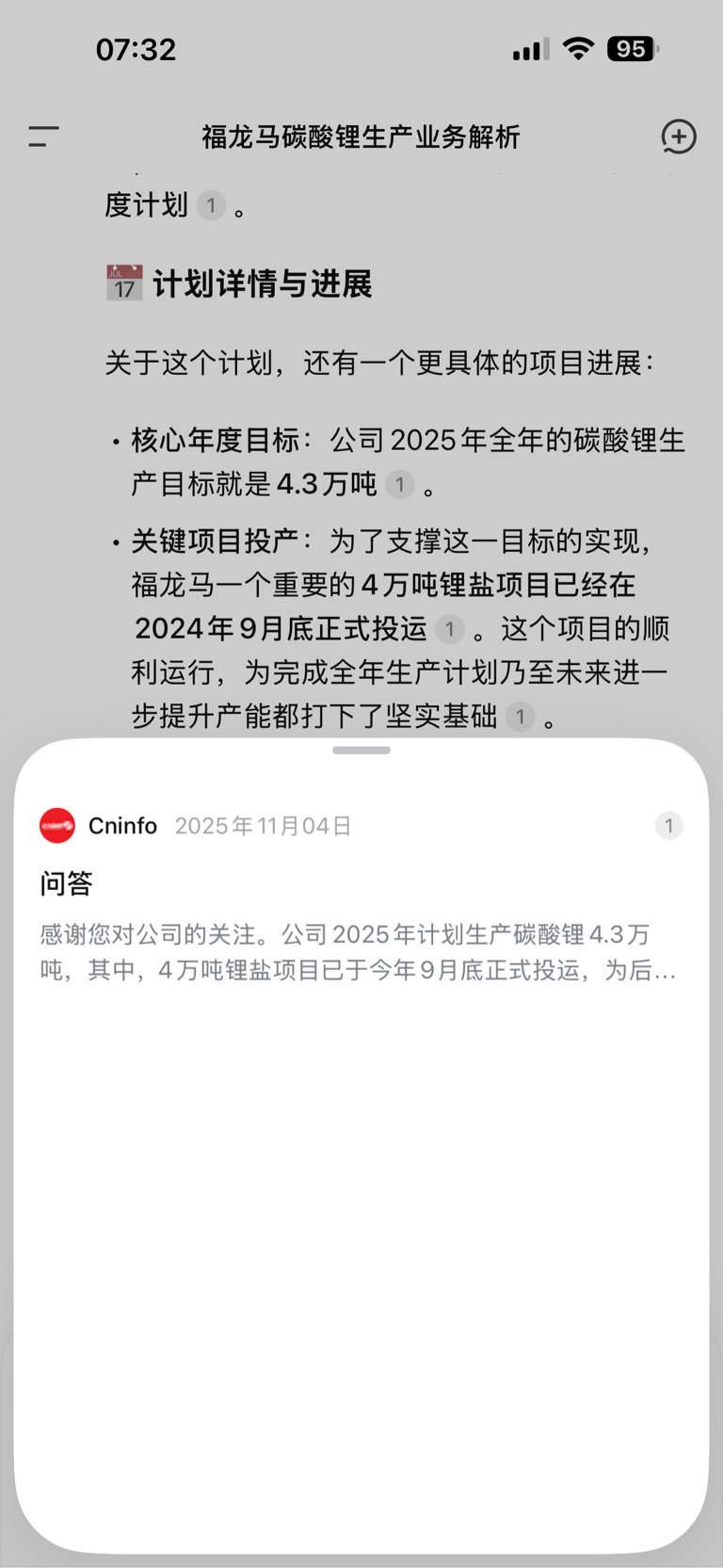 总的来说,福龙马的4.3万吨碳酸锂生产计划是当前正在执行的2025年目标,并且已有相应的新产能投入运营以保障计划的达成。