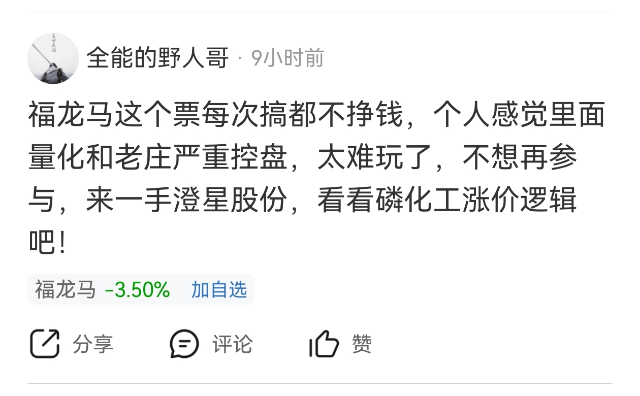 $福龙马(SH603686)$ 这个票做了两次,两次都亏钱,野哥不开心