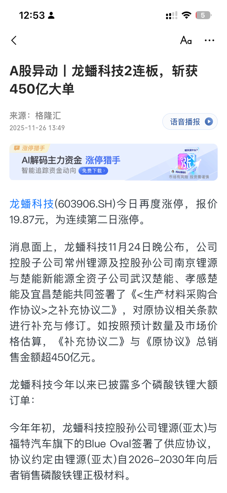 各位醒醒吧,不要以为龙蟠科技跌了22%的时候,突然450亿大单连续两个板,市值从