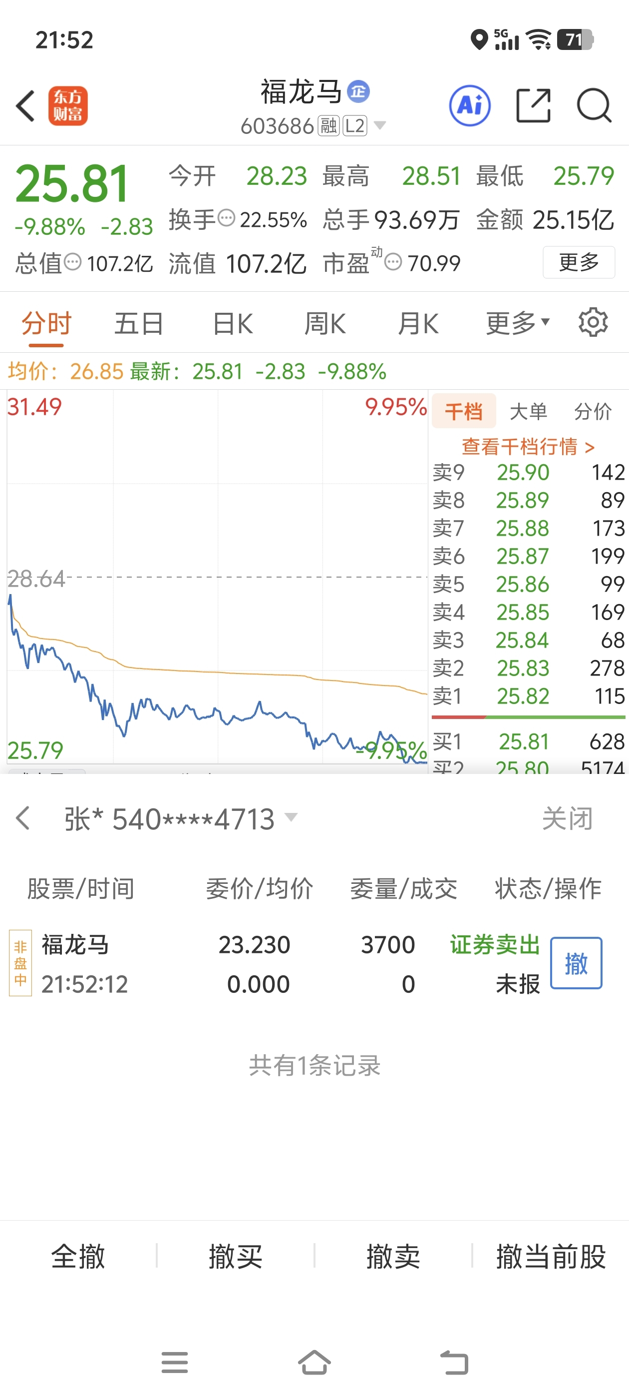 $福龙马(SH603686)$ 都不想好一起s挂跌停板23.23出