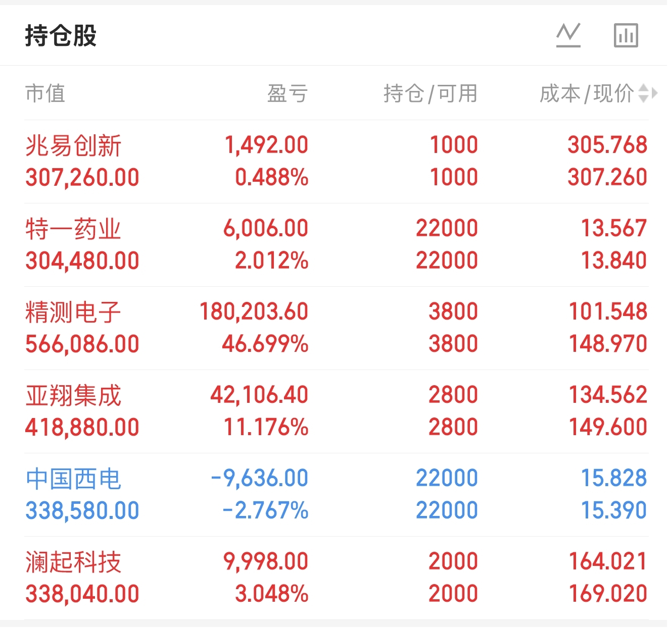 精测电子跟着领头羊从小当家过来的都知道,一直拿在手里,持仓收益近50%。一直在早盘和晚盘提到这个标的的上涨预期,即便是周一行情大跌,也提到这两天的走势特别重要。那昨天是一个阳线,今天要还有阳线,那么还可以继续高举高打。能够突破平台箱体,就看今天的表现了。