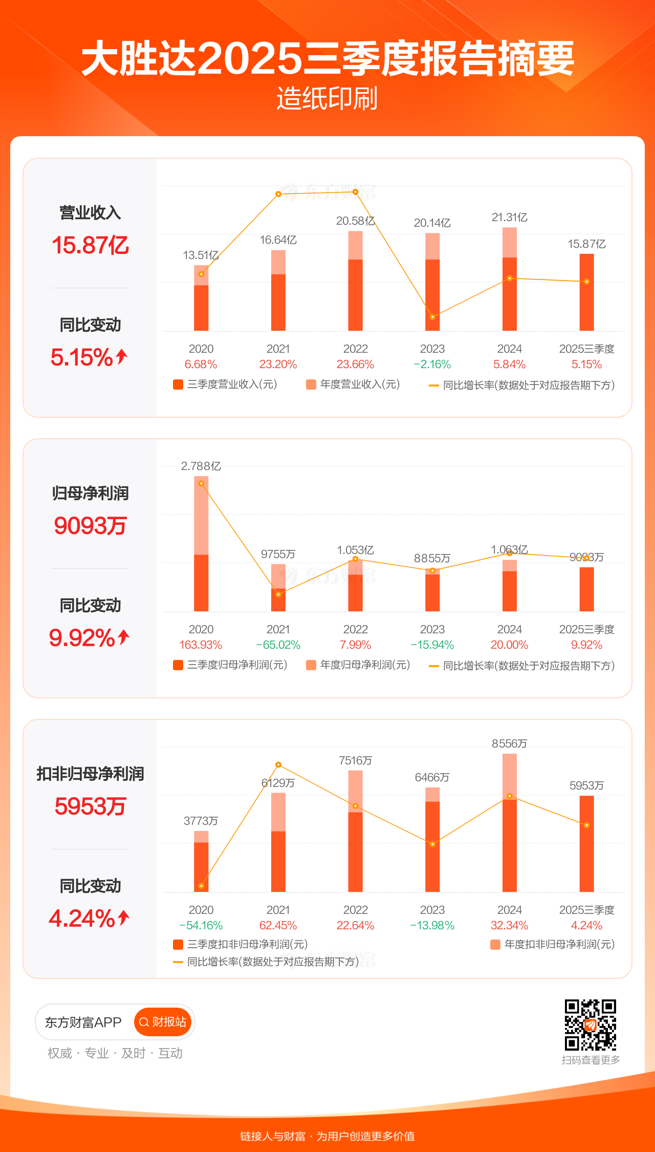 大胜达10月30日发布2025年三季报显示,公司前三季实现营业收入15.87亿元,同比增长5.15%;归母净利润9092.58万元,同比增长9.92%;扣非归母净利润5953.09万元,同比增长4.24%。
