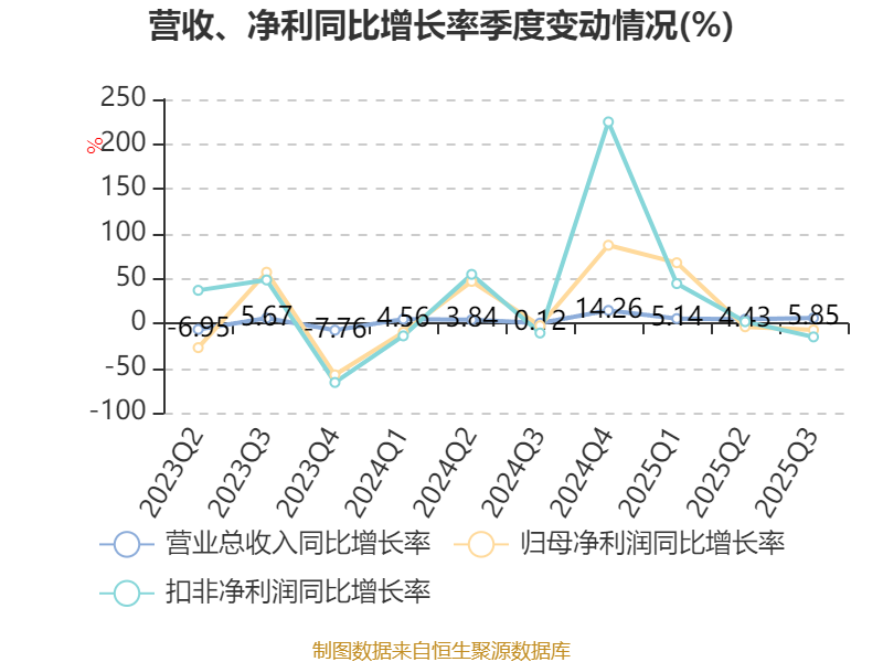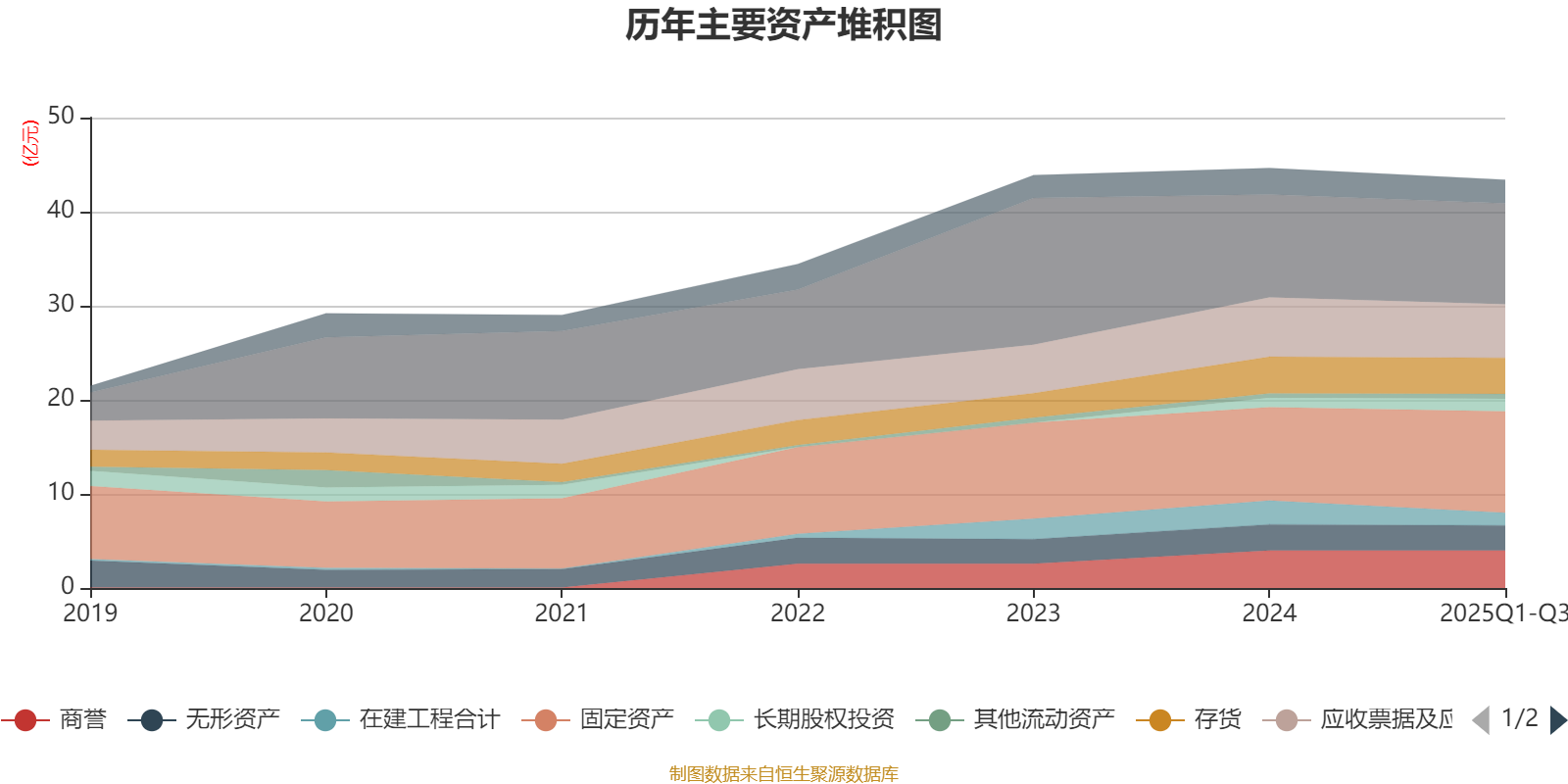 资产重大变化方面,截至2025年三季度末,公司固定资产较上年末增加8.55%,占公司总资产比重上升2.59个百分点;在建工程合计较上年末减少46.65%,占公司总资产比重下降2.56个百分点;应收票据及应收账款较上年末减少9.88%,占公司总资产比重下降1.03个百分点;长期股权投资较上年末增加35.31%,占公司总资产比重上升0.87个百分点。