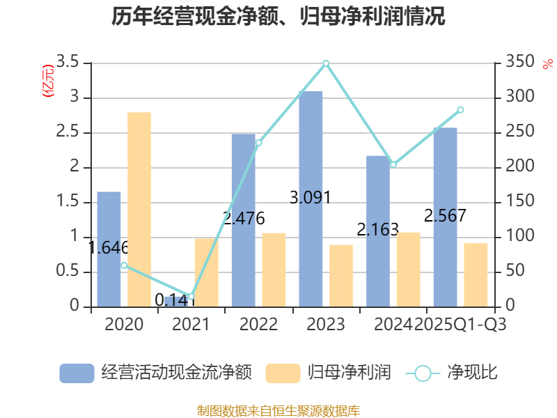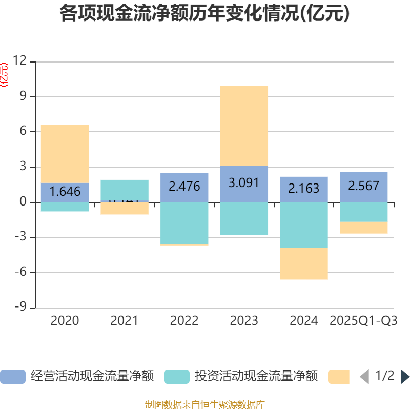 2025年前三季度,公司经营活动现金流净额为2.57亿元,同比增长30.99%;筹资活动现金流净额-9999.63万元,同比增加1.12亿元;投资活动现金流净额-1.68亿元,上年同期为-1.95亿元。