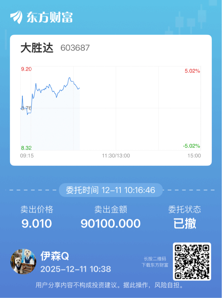 $大胜达(SH603687)$ 最后1万股, 清仓走人
