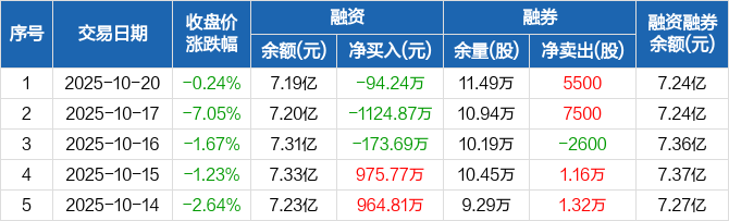 融资方面,当日融资买入3394.93万元,融资偿还3489.17万元,融资净偿还94.24万元,连续3日净偿还累计1392.79万元。融券方面,融券卖出6600股,融券偿还1100股,融券余量11.49万股,融券余额438万元。融资融券余额合计7.24亿元。