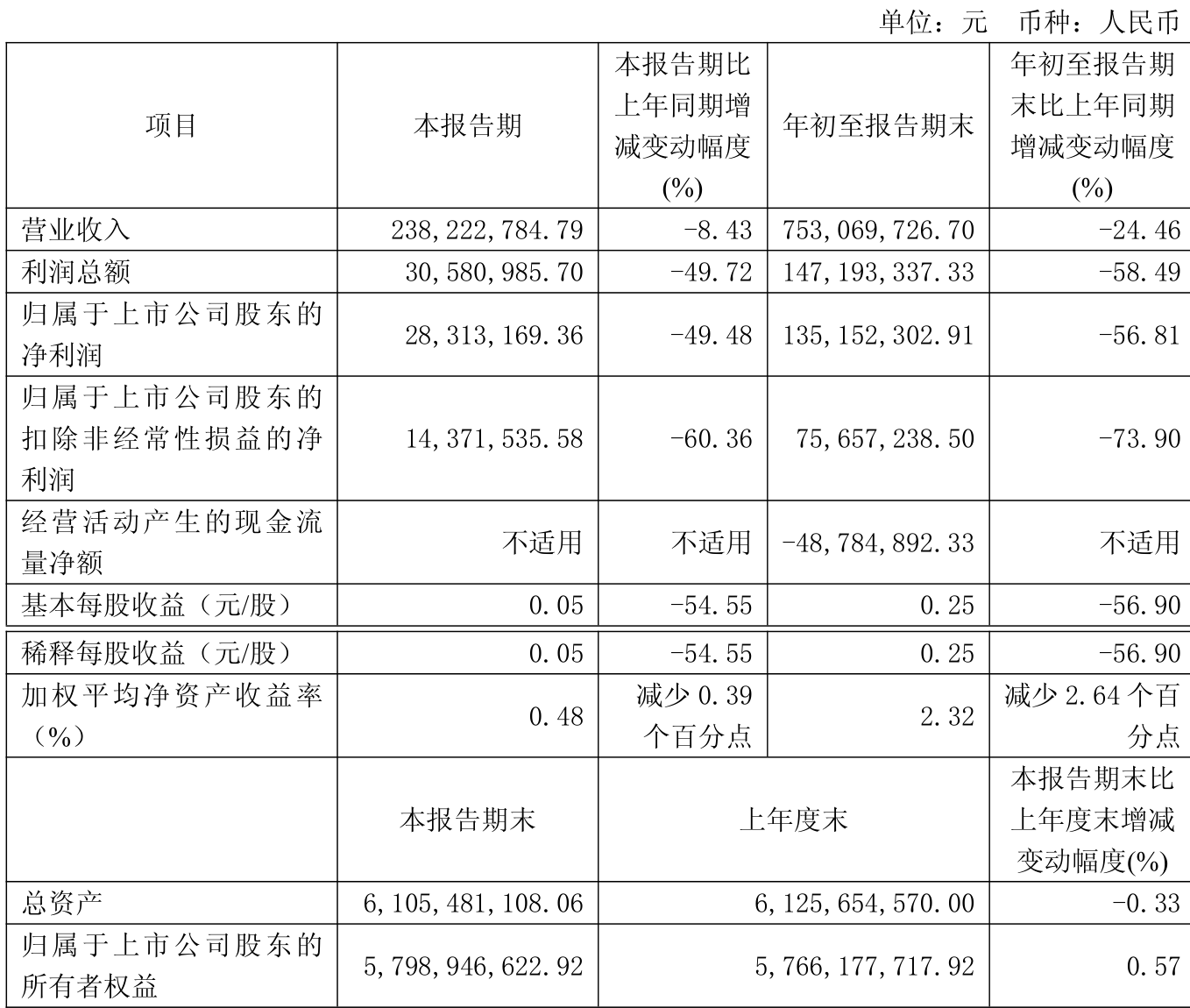 中证智能财讯石英股份(603688)10月25日披露2025年第三季度报告。前三季度公司实现营业总收入7.53亿元,同比下降24.46%;归母净利润1.35亿元,同比下降56.81%;扣非净利润7565.72万元,同比下降73.90%;经营活动产生的现金流量净额为-4878.49万元,上年同期为7.37亿元;报告期内,石英股份基本每股收益为0.25元,加权平均净资产收益率为2.32%。