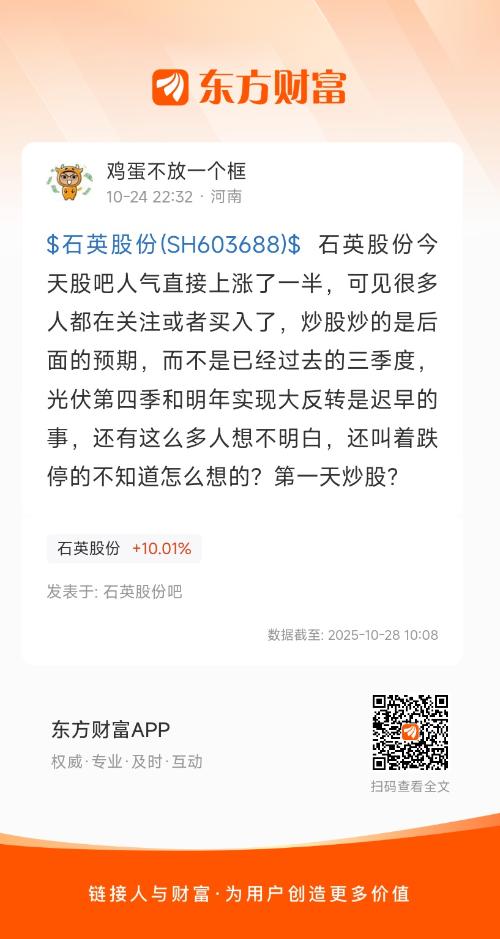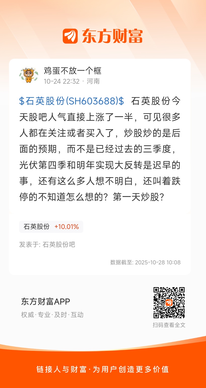 $石英股份(SH603688)$ 石英股份今天股吧人气直接上涨了一半,可见很多人都在关注或者买入了,炒股炒的是后面的预期,而不是已经过去的三季度,光伏第四季和明年实现大反转是迟早的事,还有这么多人想不明白,还叫着跌停的不知道怎么想的?第一天炒股?