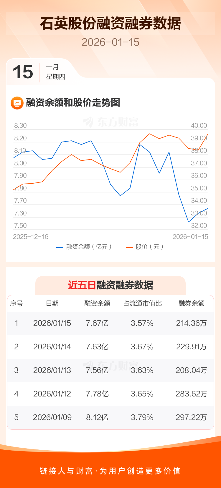 交易所最新数据显示,石英股份于2026年1月15日获融资买入8045.05万元,融资偿还7662.71万元,当日融资净买入382.33万元。目前,该股融资余额7.67亿,占流通市值比例为3.57%。