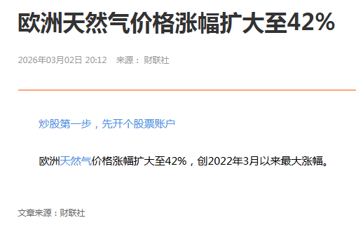 欧洲天然气价格涨幅扩大至42%,创2022年3月以来最大涨幅。